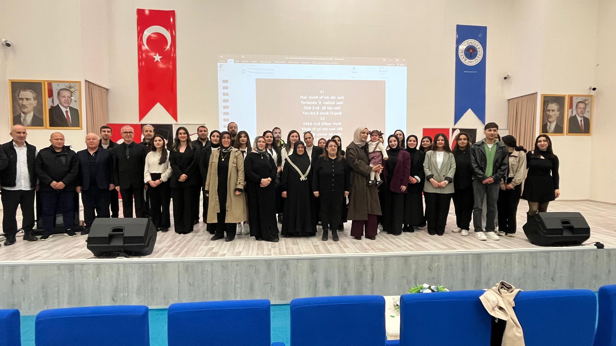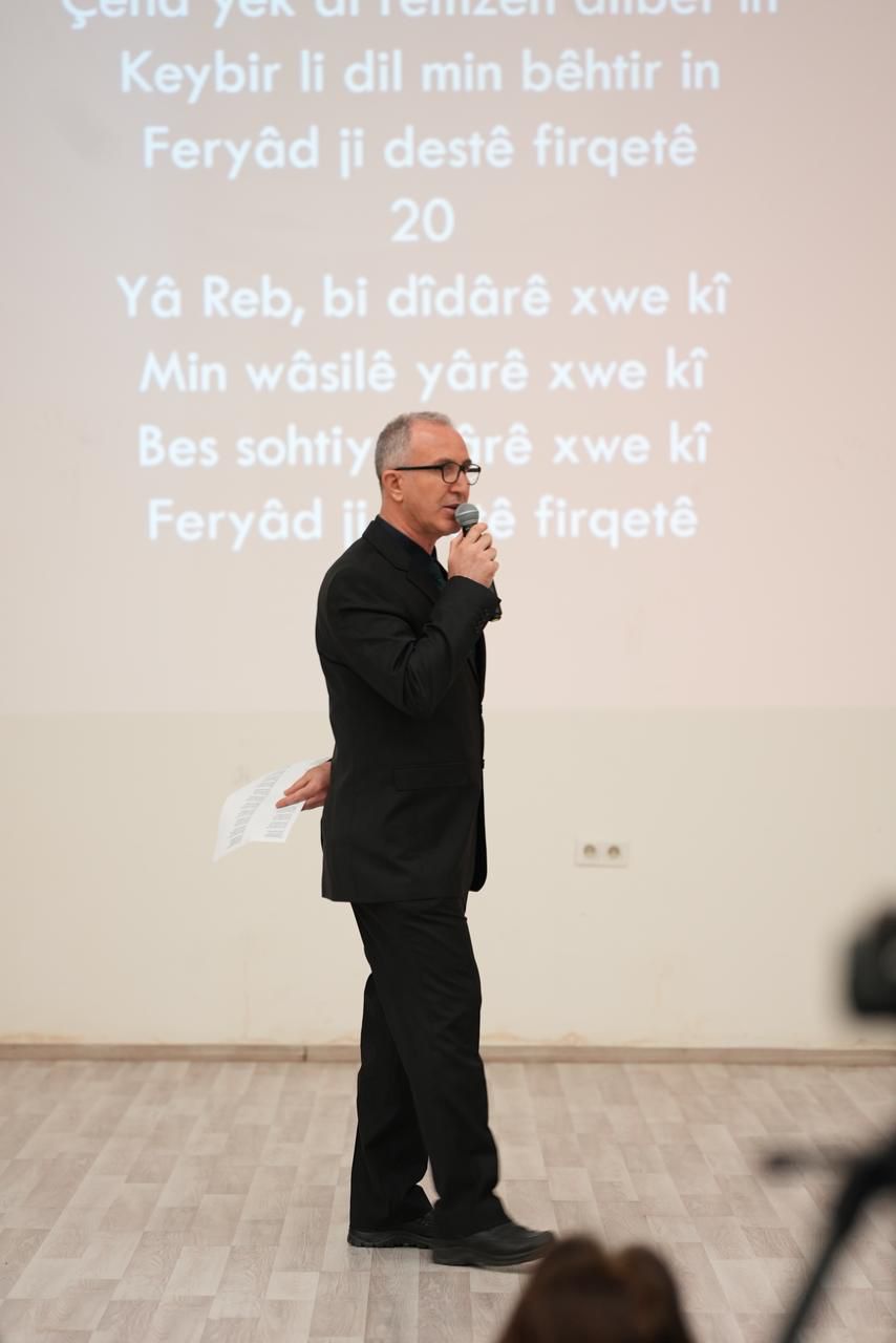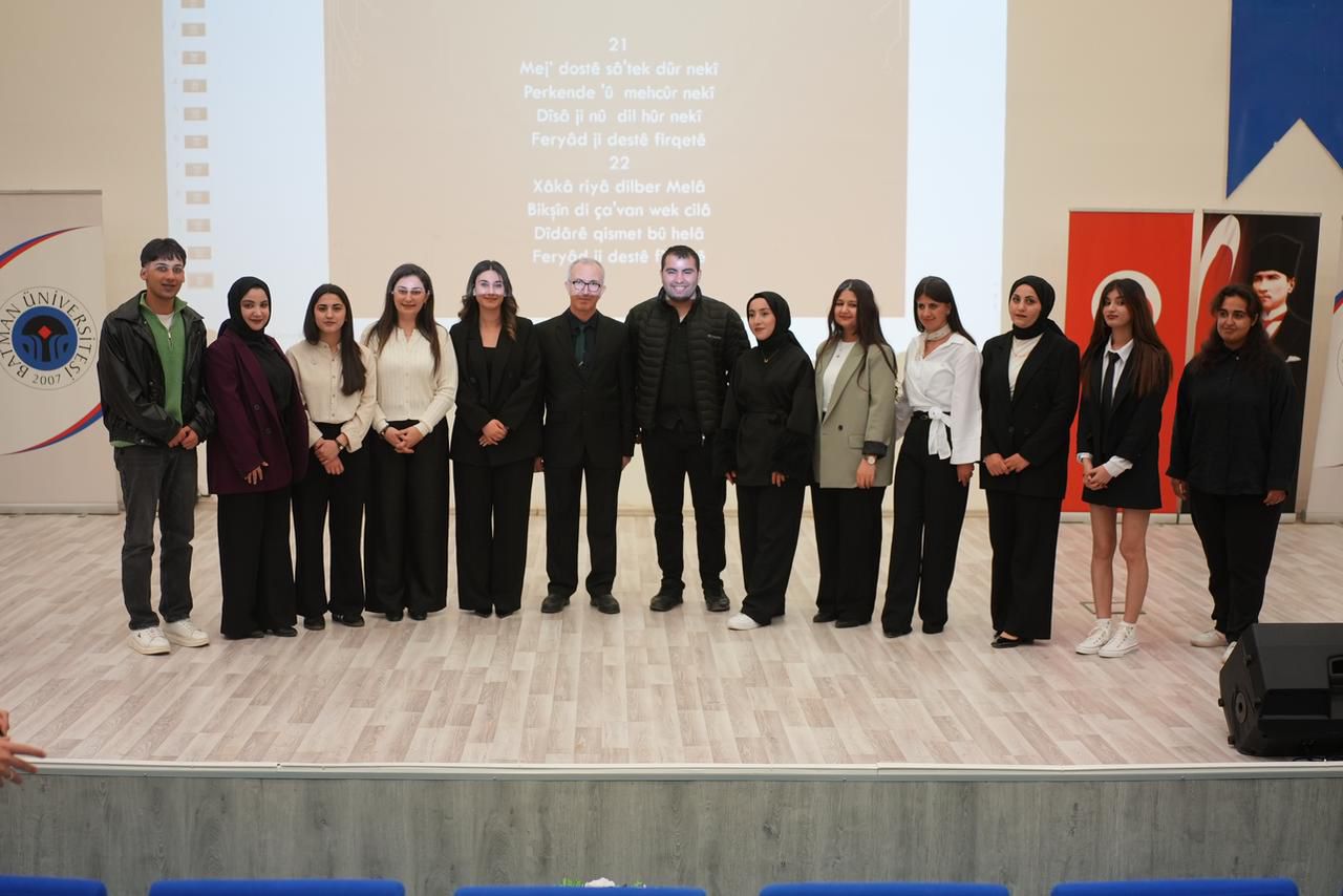 "Çok Dilli Şiir Dinletisi", Üniversitemizin Fen Edebiyat Fakültesi Konferans Salonu'nda, 14 Nisan 2026 saat 11:00'de, Türk Dili ve Edebiyatı Bölümü Öğrencileri ve Prof. Dr. Mahfuz ZARİÇ'in seslendirdiği şiirlerle icra edildi. Şiirlerden birisi Ahmed-i Hanî'nin "Arapça, Farsça, Türkçe ve Kürtçe" mısralardan oluşan mülemma türü "Çargoşe" adlı eseri idi. Diğer bir şiir, 17. Yüzyıl Klasik dini-tasavvufî şiirinin ustalarından Melâ-yi Cizîrî'ye ait kaside türü "Feryad ji Destê Firqetê" adlı eseri idi. Seslendirilen diğer dokuz şiir, Batman ve civarına ait Halk Edebiyatı ve Halk Kültürü motiflerinden hareketle Prof. Dr. Mahfuz ZARİÇ tarafından kaleme alınmış şiirlerden oluşmakta idi. "Dolab" adlı şiir trajedi-oratorya türünde, "Bêdar" adlı şiir govend-düğün şarkısı, "Zelal Han" adlı şiir tarih düşme-güzelleme, "Dîko û Rovî" fabl türünde idi. "Gur Tê" adlı şiir Kürtçe hayvan adlarının öğretilmesi için, "Îşev Şevka Baranê" adlı şiir Kürtçe meteoroloji terimlerinin öğretilmesi için kaleme alınmış didaktik bir eser idi. "Jinebîno" eski köy düğünlerindeki genç kız-dul kadın atışmalarına ait bir örnek idi. "Dewkilê" ve "Dew Furî" adlı şiirlerde ise çoban kızların lirik duyguları pastoral motifler eşliğinde dile getirilmişti.
