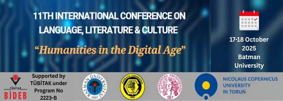 Çankaya Üniversitesi tarafından baÅŸlatılan ve her yıl farklı bir üniversitede düzenlenen “International Conference on Language, Literature & Culture” kongresinin 11. edisyonu, Batman Üniversitesi, Çankaya Üniversitesi, Slovakya Prešov Üniversitesi ve Polonya ToruÅ„ Nicolaus Copernicus Üniversitesi iÅŸ birliÄŸiyle, Batman Üniversitesi Batı Dilleri ve Edebiyatları Bölümü ile Yabancı Diller Yüksekokulu ev sahipliÄŸinde, “Humanities in the Digital Age” temasıyla 17-18 Ekim 2025 tarihinde Fen Edebiyat Fakültesi Konferans Salonunda gerçekleÅŸtirilecektir.
