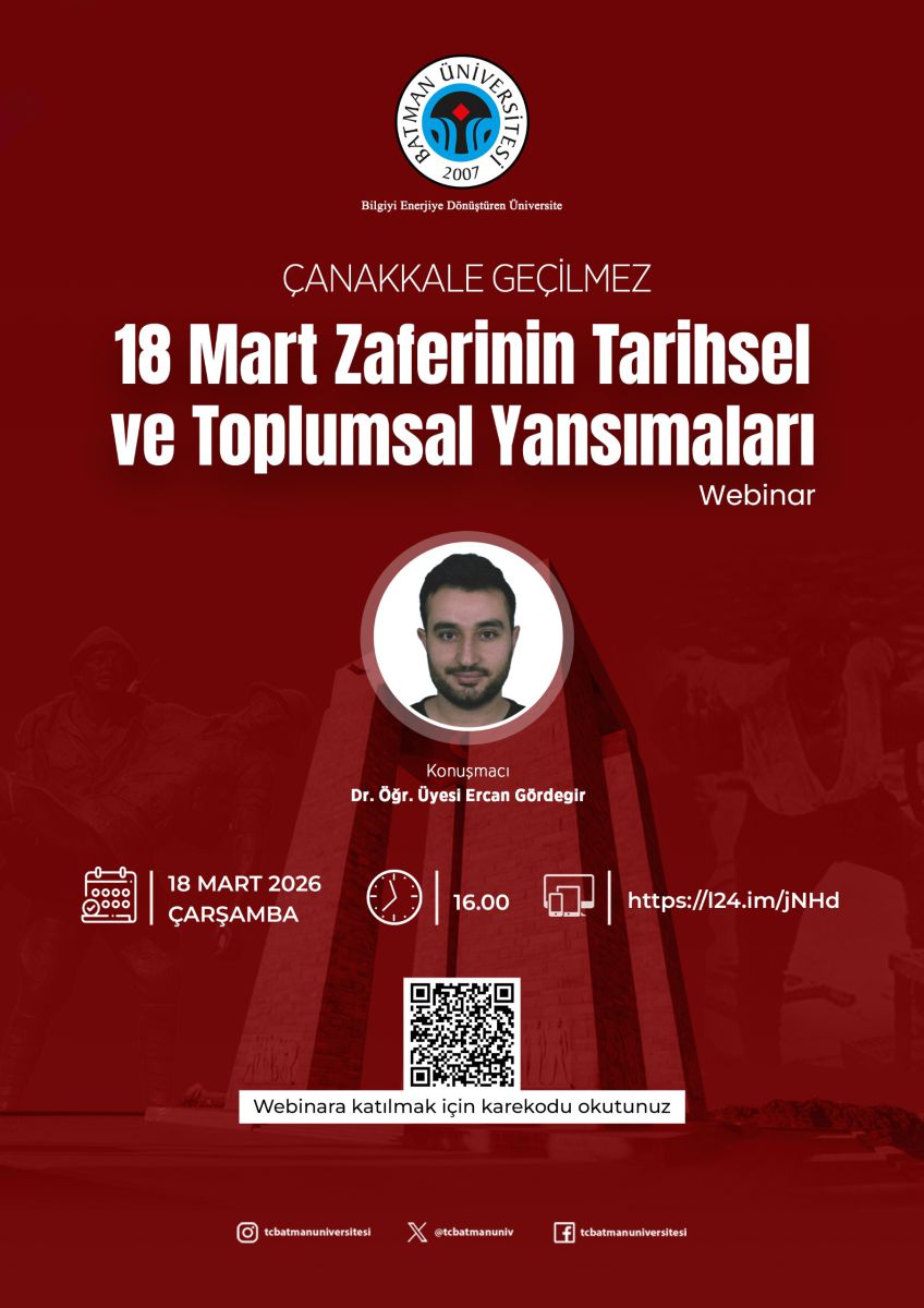 Üniversitemizde 18 Mart Çanakkale Zaferi’nin 111. yıl dönümü dolayısıyla “18 Mart Zaferinin Tarihsel ve Toplumsal Yansımaları” baÅŸlıklı webinar programı gerçekleÅŸtirildi. GerçekleÅŸtirilen programa Üniversitemiz akademik ve idari personelin yanı sıra öÄŸrenciler yoÄŸun ilgi gösterdi.