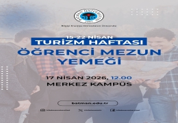 Üniversitemiz turizm bilincini güçlendirmek ve sektörel farkındalığı artırmak amacıyla “50. Turizm Haftası” etkinliklerini 15–22 Nisan 2026 tarihleri arasında geniş kapsamlı bir programla gerçekleştiriyor. Batı Raman Kampüsündeki etkinlikler, Batman Valiliği himayesinde Üniversitemiz ve İl Kültür Turizm Müdürlüğü iş birliğiyle hayata geçiriliyor.