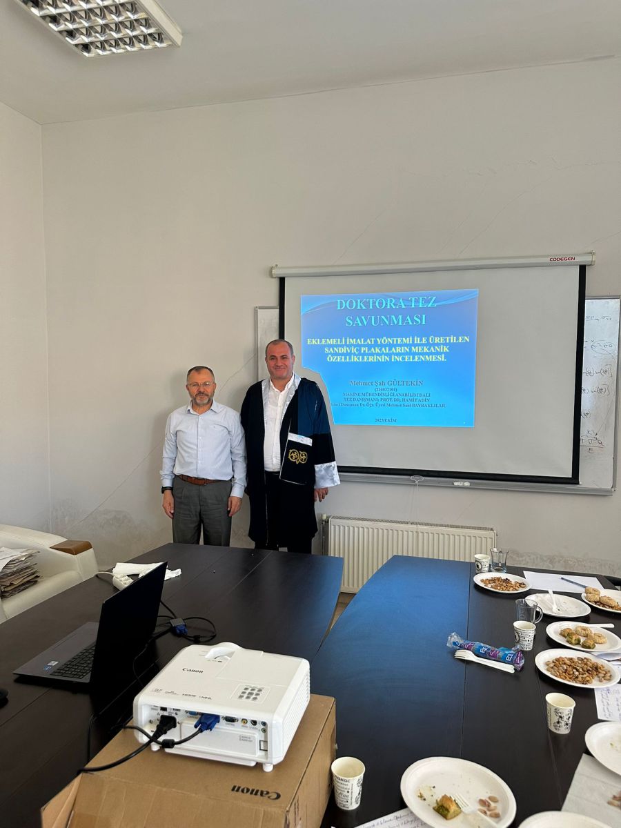 Anabilim Dalımız Doktora öğrencilerinden Mehmet Şah GÜLTEKİN’ ın "Eklemeli İmalat Yöntemi ile Üretilen Sandviç Kompozit Plakaların Mekanik Özelliklerinin İncelenmesi" adlı Tez Savunması 20.10.2025 tarihinde Makine Mühendisliği Bölümü Toplantı Salonunda Saat 10.00 da gerçekleştirilmiştir. Tez savunmasına Prof. Dr. Hamit ADİN, Doç. Dr. Şehmus BADAY, Doç. Dr. Oğuz TUNÇEL, Doç. Dr. Melih KUNCAN, Dr. Öğr. Üyesi İsmail BAYAR ve Dr. Öğr. Üyesi Mehmet Sait BAYRAKLILAR ve izleyiciler iştirak etmişlerdir. Tez savunması soru ve cevaplarla tamamlanmıştır.