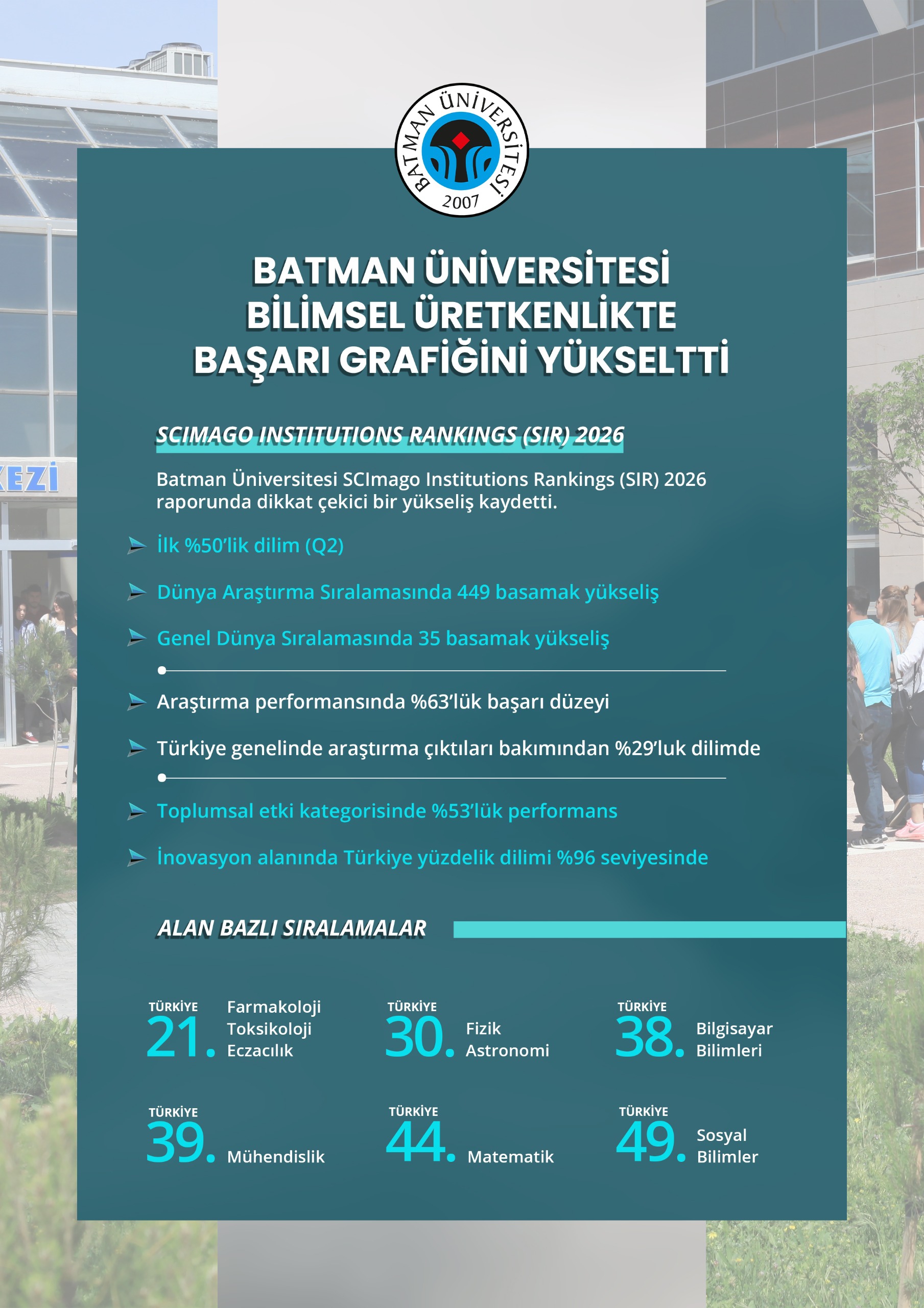 SCImago Institutions Rankings (SIR) 2026 değerlendirme sonuçlarına göre Üniversitemiz, uluslararası akademik sıralamalarda önemli bir yükseliş elde ederek bilimsel üretkenliğini artırdığını ortaya koydu.Üniversitemiz, 2025 yılına kıyasla Dünya Araştırma Sıralamasında 449 basamak yükselerek dikkat çekici bir ilerleme kaydetti. Bu yükseliş, üniversitede yürütülen bilimsel çalışmaların artması ve uluslararası indeksli dergilerde yayımlanan araştırmaların etkisinin güçlenmesiyle ilişkilendirildi. Genel Dünya Sıralamasında da ilerleme kaydeden Üniversitemiz, 35 basamak yükselerek küresel ölçekteki konumunu daha da güçlendirerek Best Quartile’de Q2’deki yerini pekiştirdi.