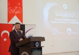Programın devamında Fen Edebiyat Fakültesi Türk Dili ve Edebiyatı Bölümü Öğretim Üyemiz Prof. Dr. Ferhat Korkmaz tarafından “Küresel Emperyalizme Karşı Mehmet Akif Ersoy ve İstiklal Marşı” başlıklı kapsamlı bir sunum gerçekleştirildi. Prof. Dr. Korkmaz, konuşmasında emperyalizmin antik çağlardan günümüzün dijital ve kültürel boyutlarına kadar uzanan tarihsel gelişimini ele aldı. Batı’nın sömürgeci zihniyetinin günümüzde veri sömürüsü ve teknoloji tekelleri gibi yeni formlarla devam ettiğine dikkat çeken Prof. Dr. Korkmaz, Mehmet Akif Ersoy’un İstiklal Marşı’nda yer alan “Medeniyet! dediğin tek dişi kalmış canavar” dizesinin, Batı’nın medeniyet maskesi ardına sakladığı sömürgeci ve emperyalist yüzüne karşı verilmiş en güçlü cevaplardan biri olduğunu vurguladı. Sunumunda Mehmet Akif Ersoy’un başyapıtı Safahat’tan da örnekler paylaşan Prof. Dr. Korkmaz, Milli Şair’in emperyalizme, işgale ve dönemin buhranlarına karşı ortaya koyduğu fikrî ve millî mücadeleyi çeşitli mısralarla anlattı.