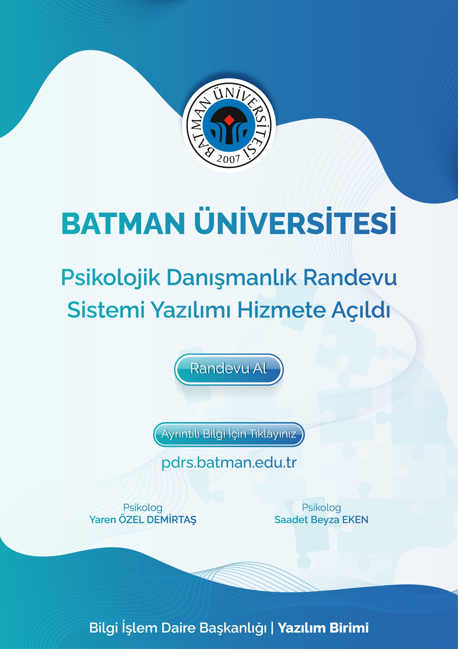 Batman Üniversitesi, psikolojik danışmanlık hizmetlerini daha düzenli, planlı ve erişilebilir bir yapıya kavuşturmak amacıyla geliştirilen Psikolojik Danışmanlık Randevu Sistemini (pdrs.batman.edu.tr) hizmete sundu. Yeni yazılım sayesinde öğrenciler ile akademik ve idari personelin psikolojik danışmanlık hizmetlerinden daha etkin ve sistemli bir şekilde yararlanabileceği kaydedildi.