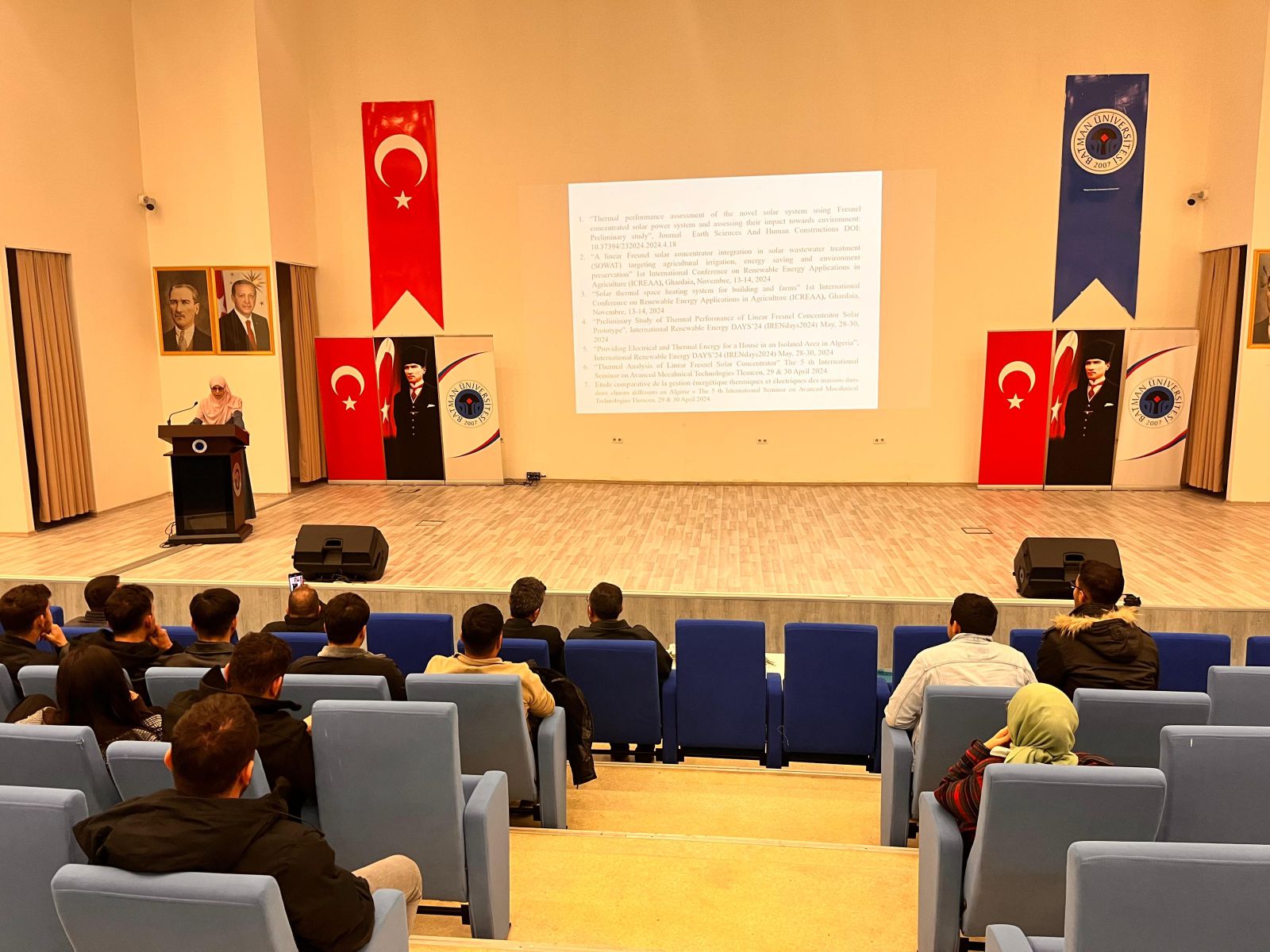 Akademisyen, kendi kurumunda yürütülen araştırmalar çerçevesinde güneş enerjisi sistemlerinin tasarımı, enerji verimliliği, sürdürülebilir teknolojiler ve çevre dostu uygulamalara ilişkin örnekler sundu. Farklı ülkelerdeki uygulamalara da değinilen sunumda, yenilenebilir enerji alanında üniversiteler arası iş birliğinin önemi vurgulandı.