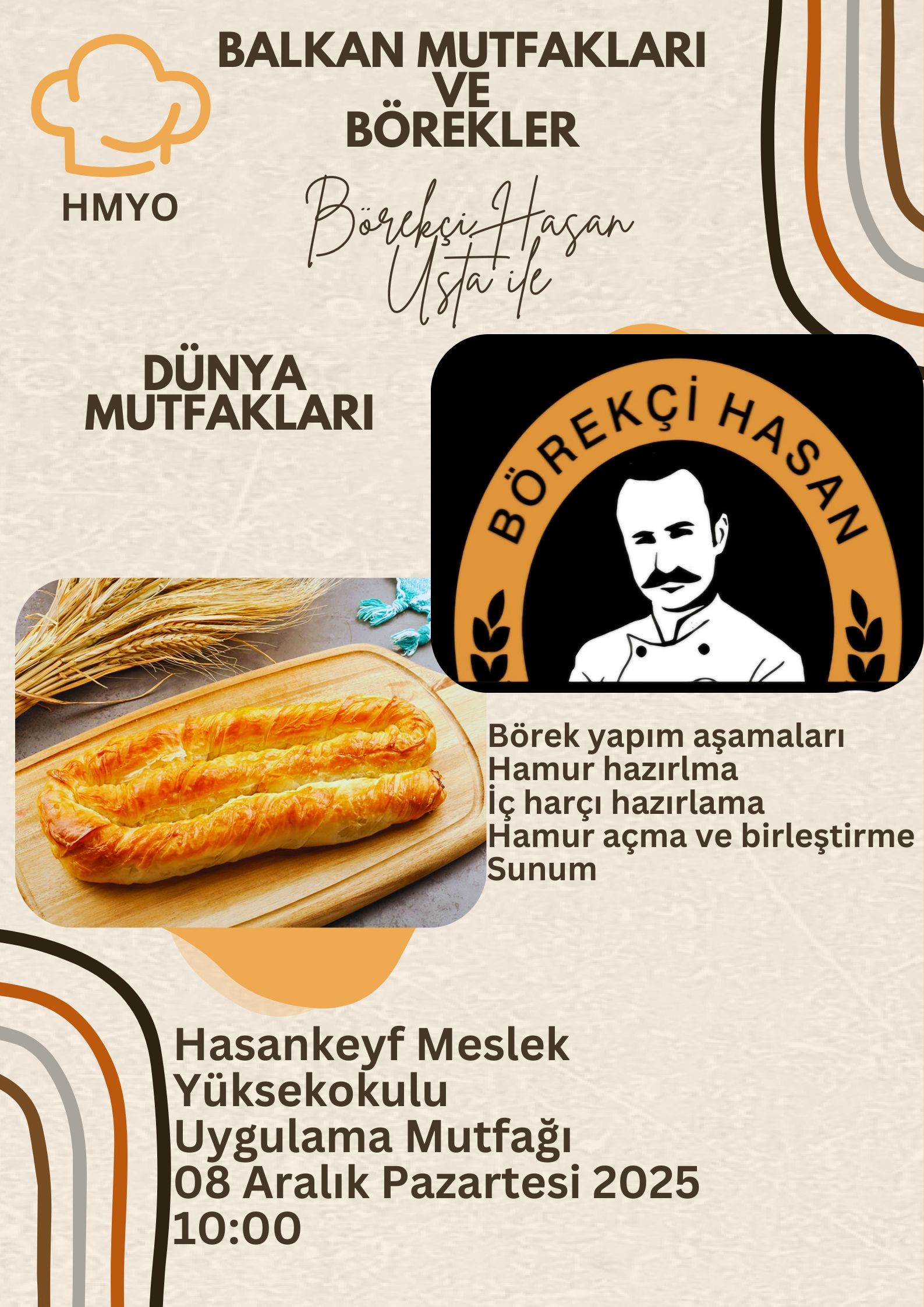 Hasankeyf Meslek Yüksekokulu Aşçılık Topluluğunun düzenlediği ‘Böreğe Dair’ etkinliği gerçekleştirildi. Konuk şef Börekçi Hasan ile yapılan workshopta öğrenciler serpme börek yapımının her anını deneyimlediler.