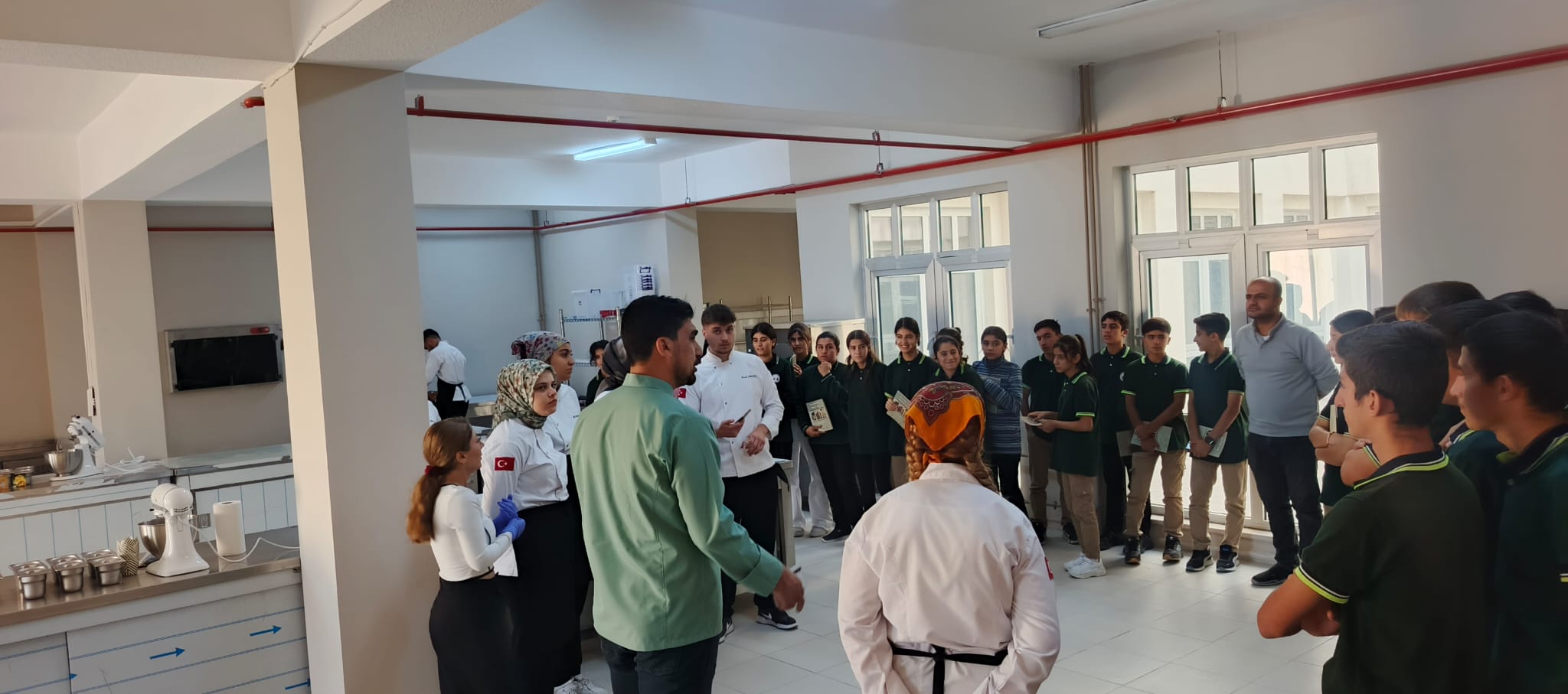 Daha sonra okulumuzun tanıtımı öğrencilere yapıldı. Öğrencilerle Pastacılık Uygulama Atölyesinde uygulama yapıldı. Pastacılık ve ekemekçilik Bölümü 2. Sınıf öğrencileri ile birlikte Muffin kek çalışması yaptı.
