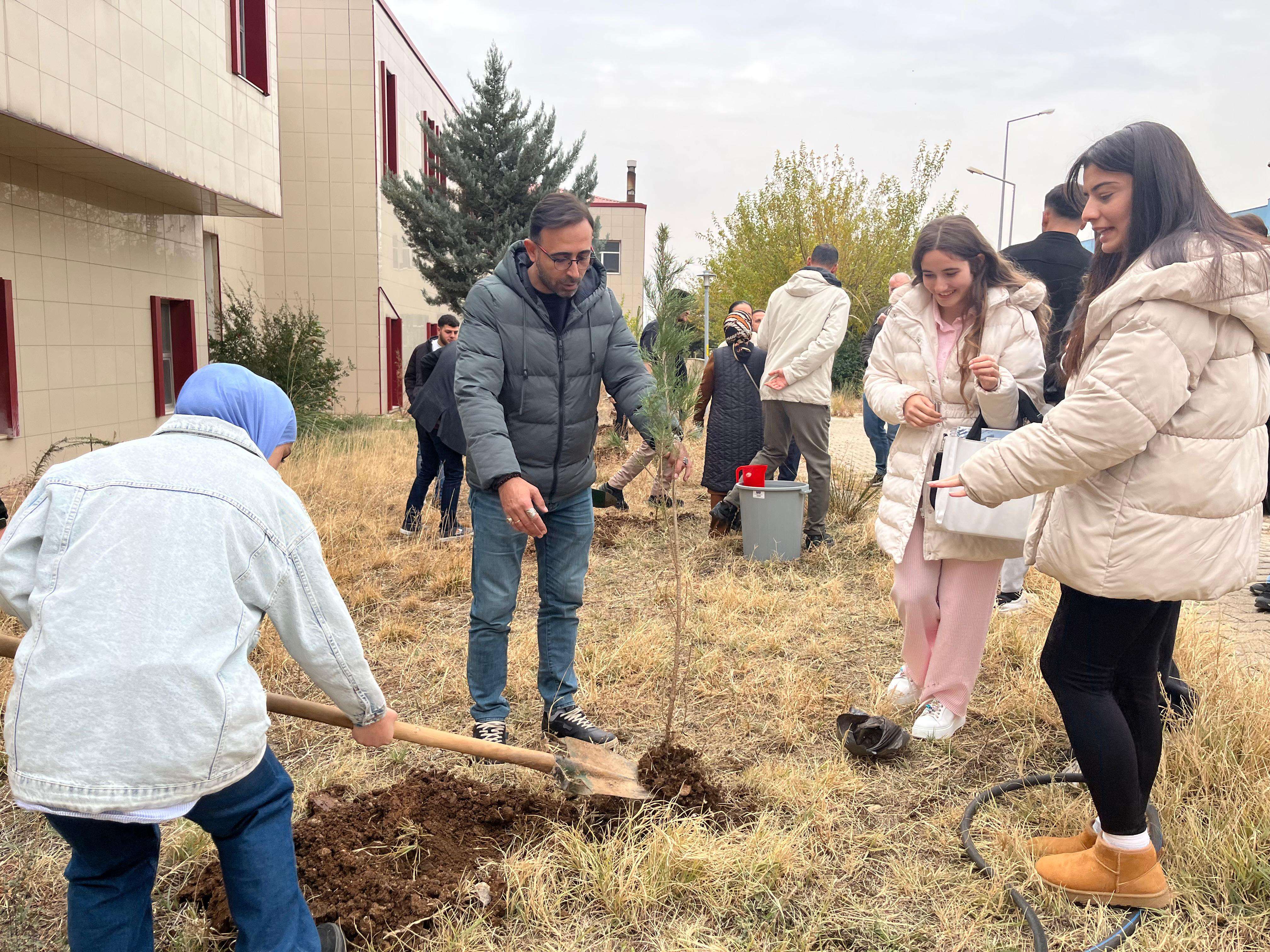 Söyleşinin ardından akademik personel, öğrenciler ve Kaymakam Böçkün’ün katılımıyla ağaç dikimi etkinliği gerçekleştirildi. Etkinlik kapsamında kampüs alanına fidanlar dikilerek çevre farkındalığına katkı sunuldu.