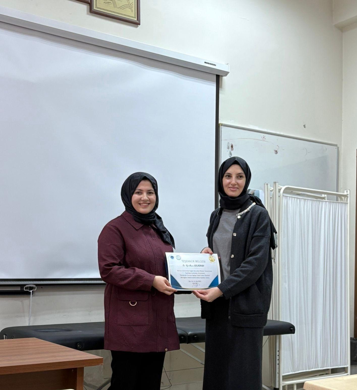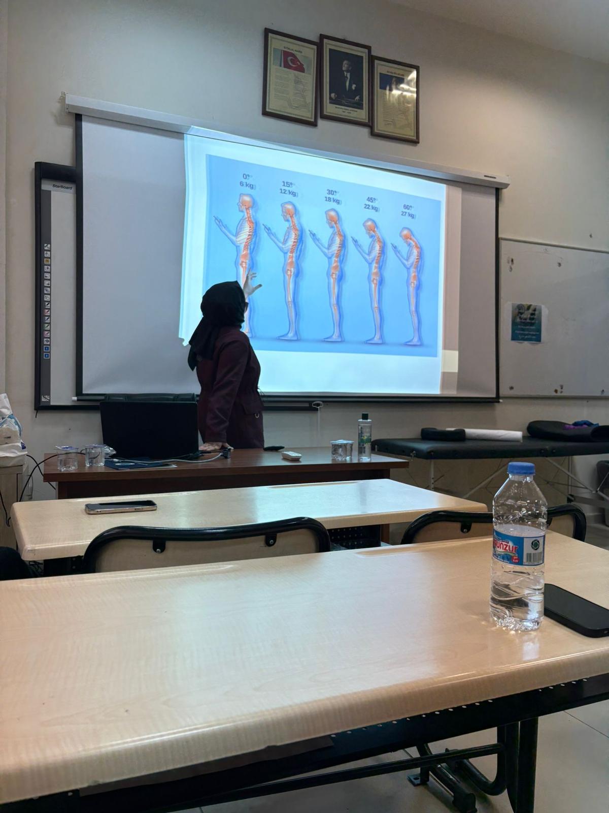 Sağlık Hizmetleri Meslek Yüksekokulu Topluluğu, gençlerde omurga sağlığına dikkat çekmek ve postür farkındalığını artırmak amacıyla düzenlenen “Gençlerde Omurga Sağlığı: Pratik Postür Önerileri” temalı ilk etkinliği yoğun ilgiyle gerçekleştirildi. Öğr. Gör. Dr. Eda EMÜL mentörlüğünde ve topluluğumuzun akademik danışmanı Doç. Dr. Tuba YALÇIN’ın destekleriyle yürütülen etkinlikte, Uzman Fizyoterapist Buşra KILICIKAN katılımcılara günlük yaşamda doğru duruş alışkanlıklarının önemi, omurga sağlığını koruma yolları ve uygulanabilir egzersiz önerileri konusunda bilgi verdi; ayrıca gönüllü öğrenciler üzerinde bireysel postür ve omurga analizi yapılarak uygulamalı olarak değerlendirildi. Hem öğrenciler hem de akademisyenler tarafından memnuniyetle karşılanan etkinlik, topluluğun ilk faaliyeti olarak başarılı bir şekilde tamamlandı.