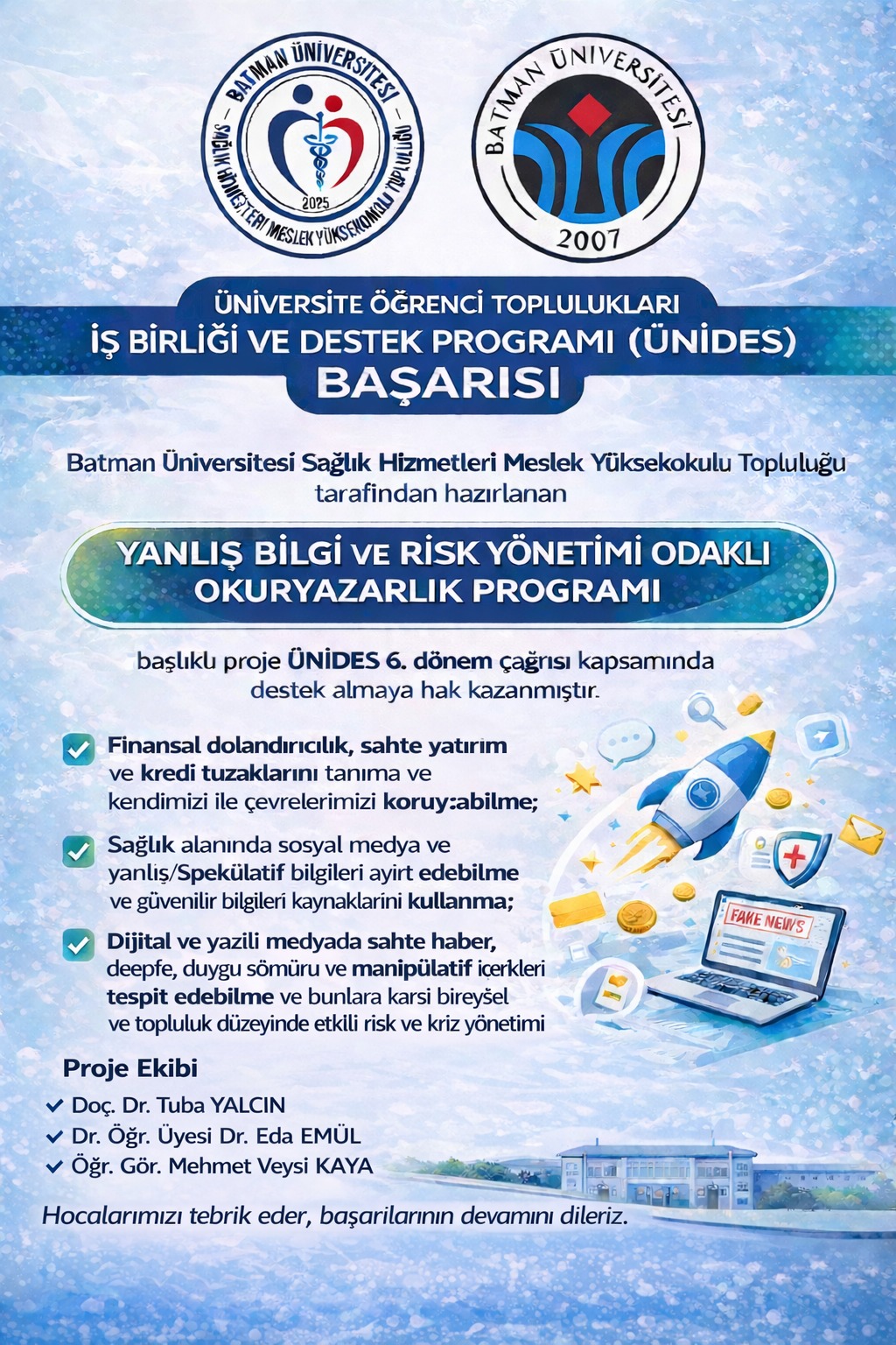 “Yanlış Bilgi Ve Risk Yönetimi Odaklı Okuryazarlık Programı” başlıklı proje ÜNİDES 6. çağrısı kapsamında destek almaya hak kazanmıştır.