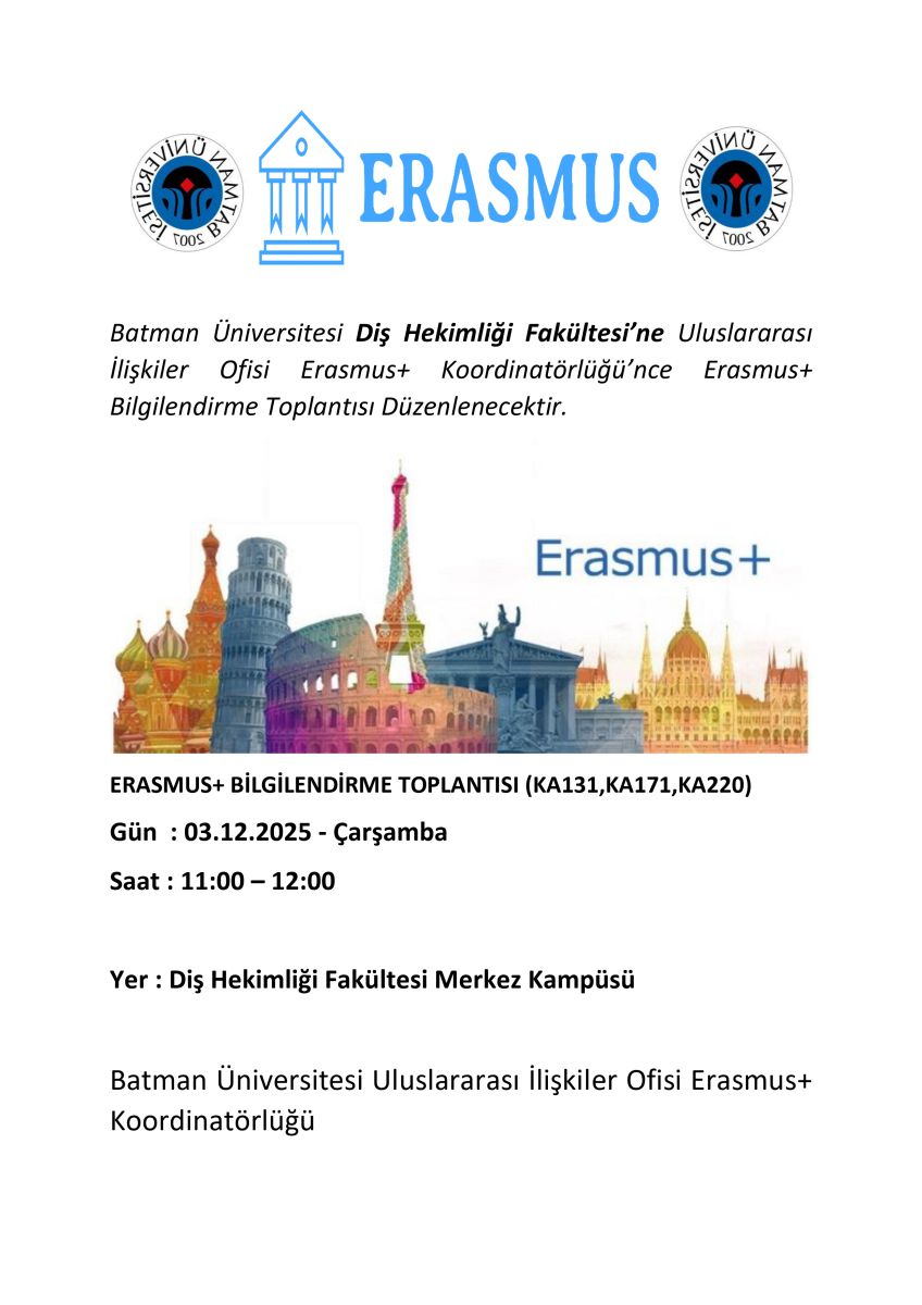 Üniversitemiz Erasmus+ Koordinatörlüğünce Diş Hekimliği Fakültesi, Akademik ve İdari Personeli ile Öğrencilerine yönelik 03.12.2025 tarihi 11:00-12:00 saatleri arasında bilgilendirme toplantısı yapılması planlanmaktadır.