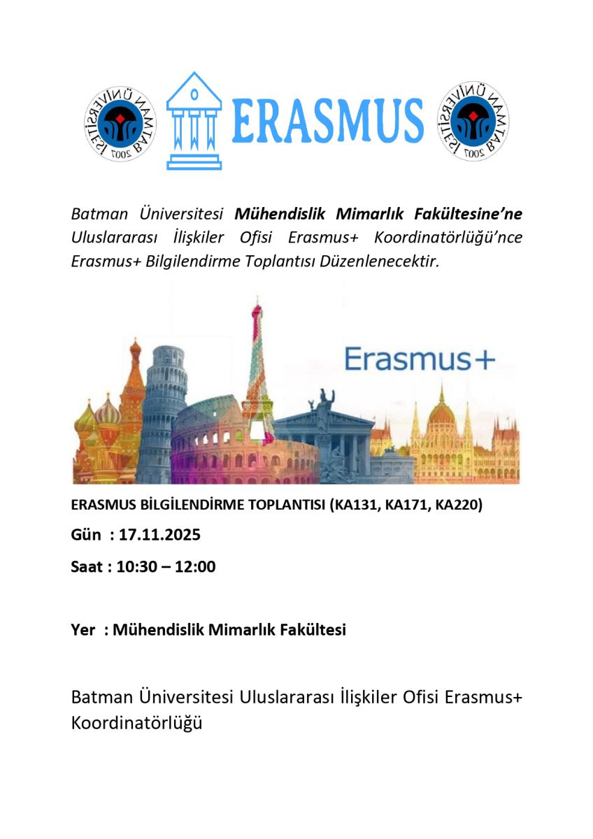 Üniversitemiz Erasmus+ Koordinatörlüğünce Mühendislik Mimarlık Fakültesinde, Akademik ve İdari Personeli ile Öğrencilerine yönelik 17.11.2025 tarihi 10:30-12:00 saatleri arasında bilgilendirme toplantısı yapılması planlanmaktadır.