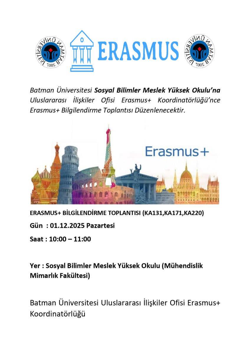 Üniversitemiz Erasmus+ Koordinatörlüğünce Sosyal Bilimler Meslek Yüksek Okuluna, Akademik ve İdari Personeli ile Öğrencilerine yönelik 01.12.2025 tarihi 10:00-11:00 saatleri arasında bilgilendirme toplantısı yapılması planlanmaktadır.