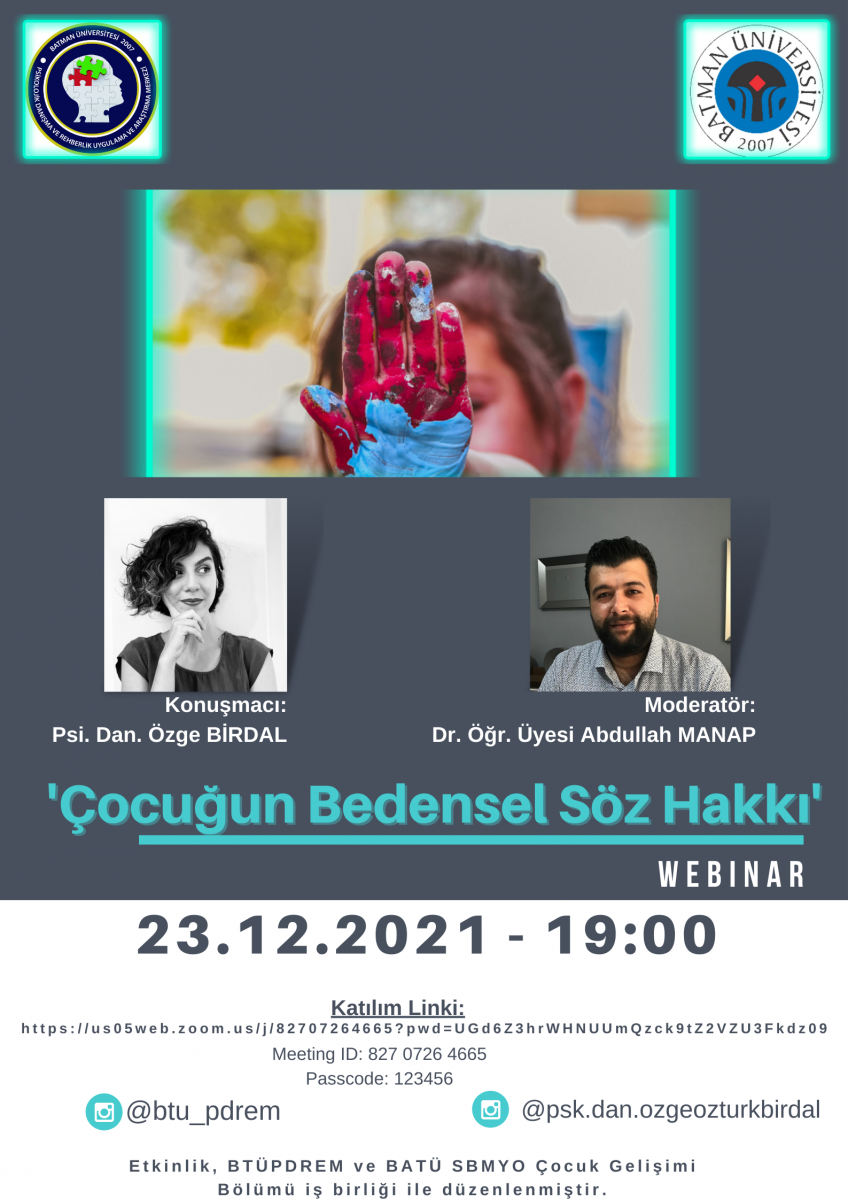 Şişli Nişantaşı Anadolu Lisesi Psikolojik Danışman'ı Özge Birdal tarafından verilecek olan "Çocuğun Bedensel Söz Hakkı" konulu Webinar'a Çocuk Gelişimi Bölümü öğrencilerimiz başta olmak üzere herkes davetlidir.