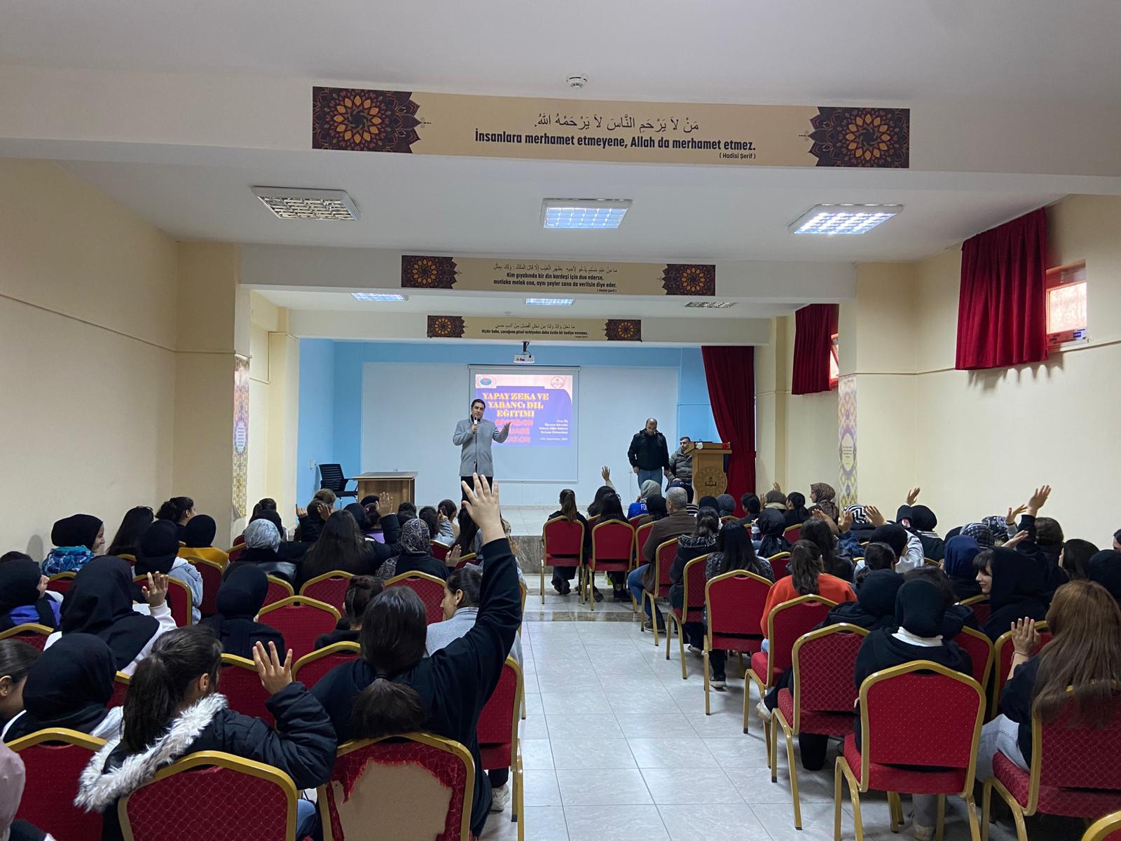 Haftanın son buluşmasında 12 Aralık 2025 tarihinde Öğr. Gör. Enes Öç “Yapay Zeka ve Yabancı Dil Eğitimi” konulu sunumu ile Halil Hamidi Anadolu İmam Hatip Lisesi öğrencileri ile bir araya geldi.