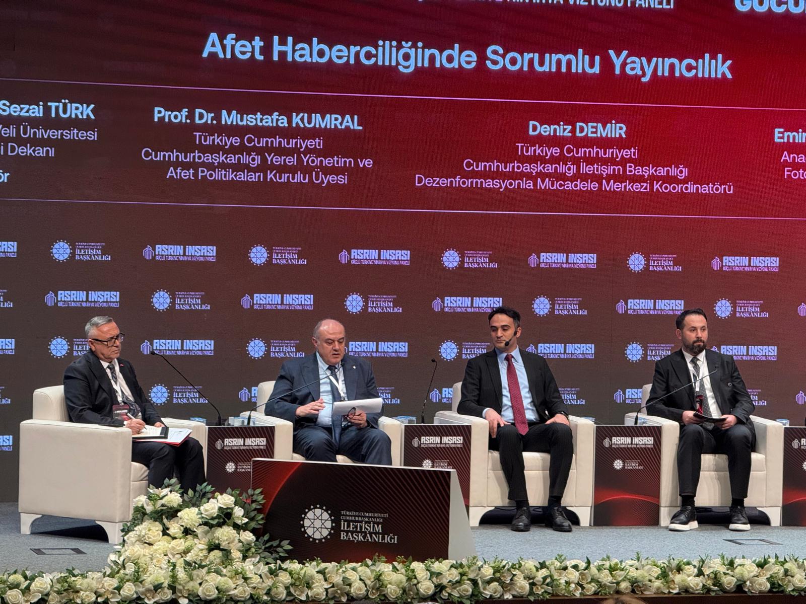 Cumhurbaşkanlığı İletişim Başkanlığı, Avrupa Birliği Erasmus+ Programı kapsamında desteklenmeye hak kazanan “Afet Haberciliği: Haberi Felakete Dönüştürmeden Önlemek” (Disaster Journalism: Preventing the News From Turning into a Disaster) projesinin kapanışının yapılması ve ülkemizin bölgeyi ihya ve inşa çalışmalarındaki başarısının ortaya konulması amacıyla uzman akademisyenler, sektör ve kamu kurumu temsilcilerinin katılımıyla “Asrın Eseri: Güçlü Türkiye’nin İhya Vizyonu Paneli” düzenlendi. Cumhurbaşkanlığı İletişim Başkanlığı Konferans Salonunda gerçekleştirilen panele; Çevre, Şehircilik ve İklim Değişikliği Bakanı Murat Kurum, Cumhurbaşkanlığı İletişim Başkanı Prof. Dr. Burhanettin Duran, Aile ve Sosyal Hizmetler Bakan Yardımcısı Dr. Sevim Sayım Madak, Ulaştırma ve Altyapı Bakan Yardımcısı Dr. Ömer Fatih Sayan ile İçişleri Bakan Yardımcısı Münir Karaloğlu’nun yanı sıra bakanlık, üniversite ve medya temsilcileri katıldı. Etkinliğe, Üniversitemiz adına Kurumsal İletişim Koordinatörü Prof. Dr. Ferhat Korkmaz katılım sağladı.