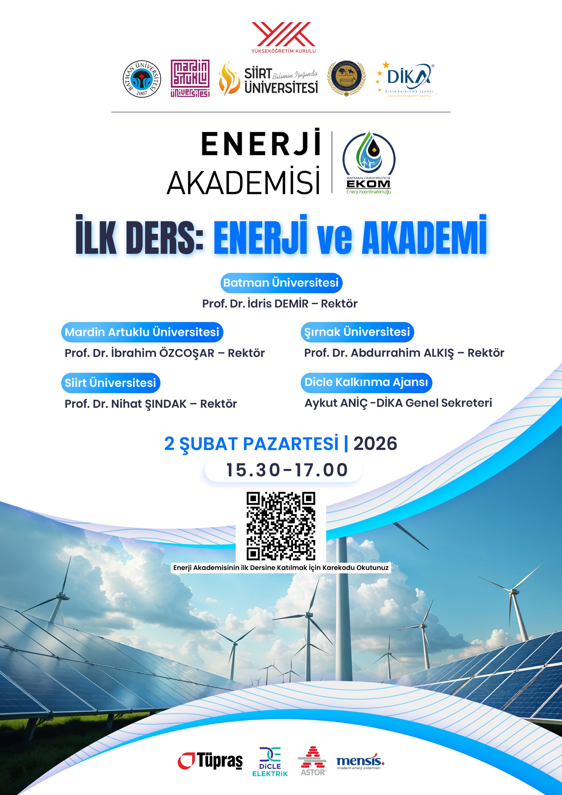 Yükseköğretim Kurulu (YÖK) himayesinde, Batman Üniversitesi koordinasyonunda kurulan “Enerji Akademisi” akademik eğitim programı başlıyor. Programın ilk dersi, 2 Şubat 2026 tarihinde Rektörümüz Prof. Dr. İdris Demir tarafından “Enerji ve Akademi” başlığıyla çevrim içi olarak gerçekleştirilecek. Açılış dersine iş birliği protokolü kapsamında yer alan Mardin Artuklu Üniversitesi Rektörü Prof. Dr. İbrahim Özcoşar, Siirt Üniversitesi Rektörü Prof. Dr. Nihat Şındak, Şırnak Üniversitesi Rektörü Prof. Dr. Abdurrahim Alkış ile Dicle Kalkınma Ajansı Genel Sekreteri Aykut Aniç katılım sağlayacak. Üniversitemiz koordinasyonunda; Siirt Üniversitesi, Şırnak Üniversitesi, Mardin Artuklu Üniversitesi ve Dicle Kalkınma Ajansı (DİKA) iş birliğiyle imzalanan Enerji Akademisi İş Birliği Protokolü kapsamında yürütülecek program, 2 Şubat – 30 Mayıs 2026 tarihleri arasında yaklaşık dört ay sürecek. Enerji sistemleri analizi, enerji ekonomisi ve politikaları, tarım-hayvancılık-enerji ilişkisi, maden ve enerji, kurumsallık ve sürdürülebilirlik ile uluslararası enerji politikaları olmak üzere altı modülden oluşan akademide, her modül temel eğitimlerle birlikte yaklaşık 40 saatlik ders içeriğini kapsayacak olup programa ülkemizin farklı illerinden toplam 10.608 başvuru yapıldığı bildirildi. Hafta içi ve hafta sonu oturumları şeklinde planlanan programla, katılımcıların enerji sektörünün teknik, ekonomik ve politik boyutlarını bütüncül bir yaklaşımla analiz etme yetkinliği kazanmaları amaçlanıyor. Teorik bilginin yanı sıra sektör uygulamalarına yönelik örneklerle desteklenecek eğitim sürecinde, katılımcıların analiz ve strateji geliştirme becerilerinin güçlendirilmesi hedefleniyor. Program kapsamında gerçekleştirilecek çevrim içi vize ve final değerlendirmeleri ile katılımcıların enerji sektörüne ilişkin bütüncül bir bakış açısı kazanmaları; ulusal ve uluslararası düzeyde politika, teknoloji ve piyasa dinamiklerini analiz edebilecek bilgi ve donanıma ulaşmaları hedeflenmektedir. Devam ve başarı koşullarını sağlayan katılımcılara, taraf üniversitelerin onayıyla katılım ve başarı belgeleri verilecektir. Derse katılım için Zoom bağlantısı: https://batman-edu-tr.zoom.us/j/95299512200?pwd=JRg4aqroUE15zV9VB7H7azFO6dQb6R.1#success