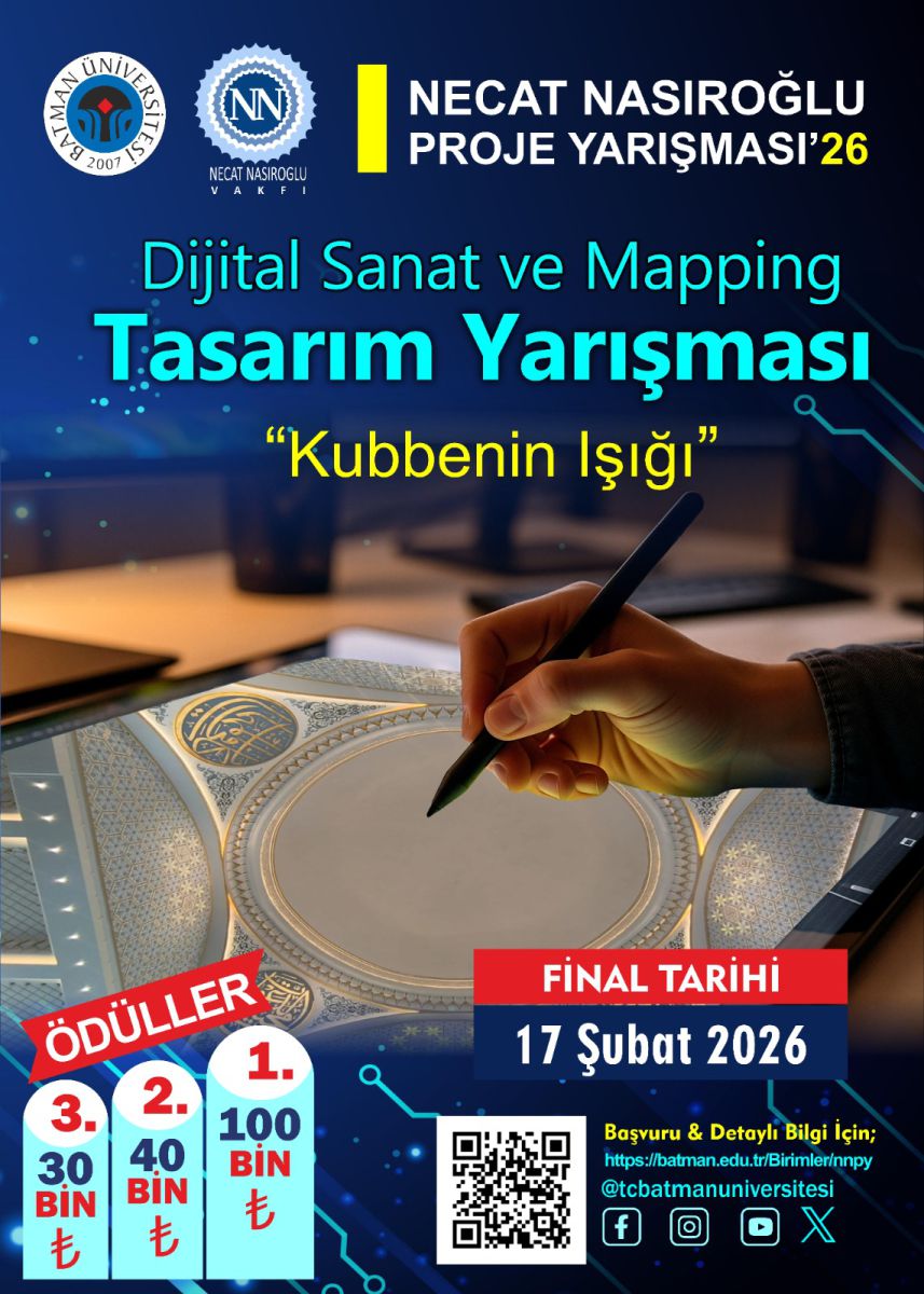 Üniversitemiz ile Necat Nasıroğlu Eğitim ve Kültür Vakfı iş birliğinde geleneksel olarak düzenlenen Necat Nasıroğlu Proje Yarışması, 2026 yılında sanat ve teknolojiyi buluşturan özel bir içerikle devam ediyor. Bu yıl “Kubbenin Işığı” temalı Dijital Sanat ve Projection Mapping Tasarım Yarışması, toplam 20 projenin katılımıyla ön değerlendirme sürecini tamamladı. Necat Nasıroğlu Külliyesi Camii’nin kubbesine uygulanmak üzere özgün ve yenilikçi projection mapping tasarımlarının hazırlandığı yarışmada kubbenin mimari formuna uygun, manevi ve kültürel bütünlüğü gözeten çalışmalar jüri karşısına çıkacak. Alanında uzman jüri üyeleri tarafından yapılacak ön değerlendirme sonucunda finale kalan eserler, 17 Şubat 2026 tarihinde düzenlenecek sergi kapsamında sanatseverlerin beğenisine sunulacak. Aynı gün gerçekleştirilecek final değerlendirmesi ve oylamanın ardından dereceye giren projeler kamuoyuyla paylaşılacak. Yarışma kapsamında birinci olan projeye 100 bin TL, ikinci projeye 40 bin TL, üçüncü projeye ise 30 bin TL ödül verilecek. Dijital sanatın mimari mekânla buluştuğu yarışma, kubbeyi bir sanat yüzeyine dönüştürerek izleyicilere özgün bir görsel deneyim sunmayı amaçlıyor.