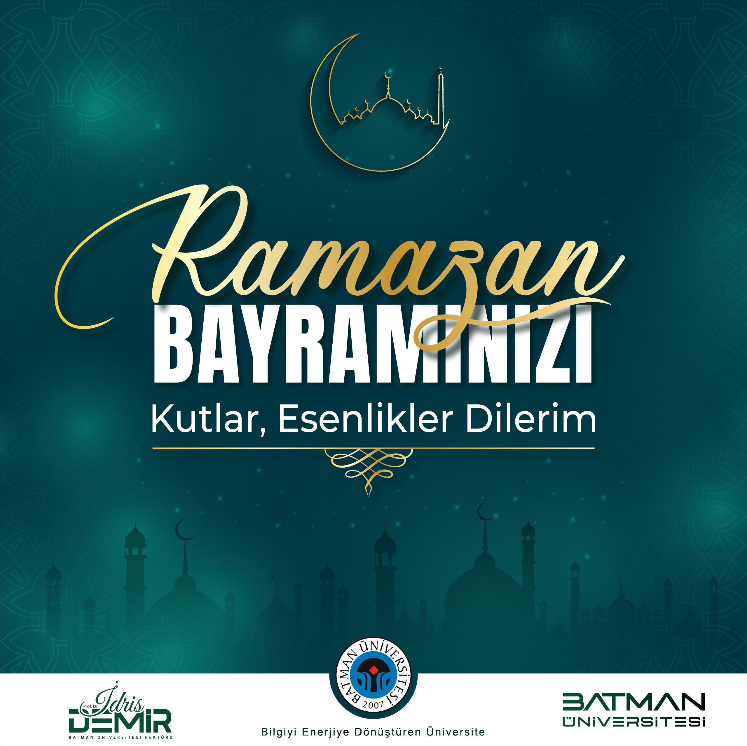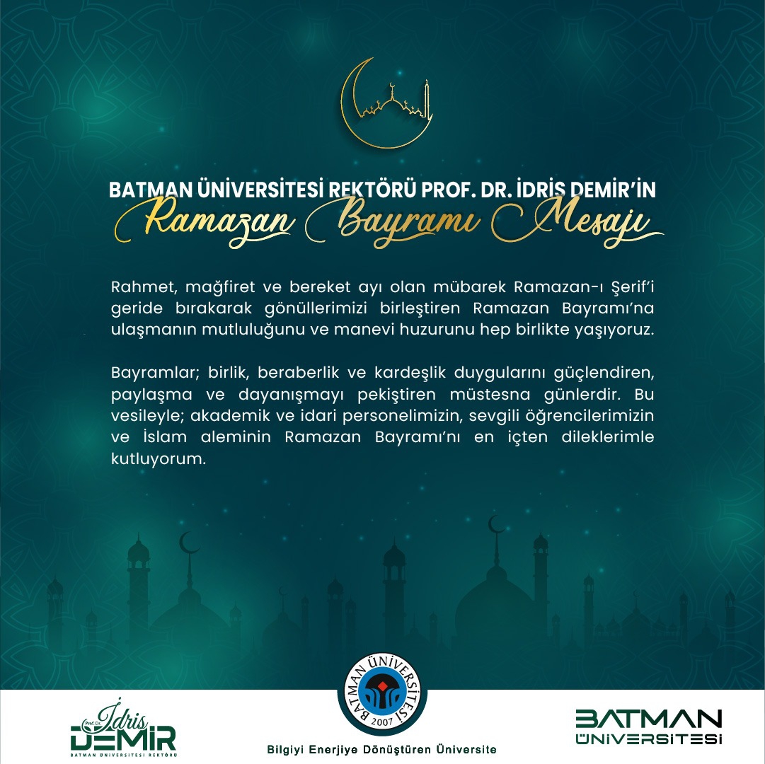 Rektörümüz Prof. Dr. İdris Demir, Ramazan Bayramı dolayısıyla bir mesaj yayımladı. Rektörümüz Prof. Dr. Demir mesajında, "Rahmet, mağfiret ve bereket ayı olan mübarek Ramazan-ı Şerif’i geride bırakarak gönüllerimizi birleştiren Ramazan Bayramı’na ulaşmanın mutluluğunu ve manevi huzurunu hep birlikte yaşıyoruz. Bayramlar; birlik, beraberlik ve kardeşlik duygularını güçlendiren, paylaşma ve dayanışmayı pekiştiren müstesna günlerdir. Bu vesileyle; akademik ve idari personelimizin, sevgili öğrencilerimizin ve İslam aleminin Ramazan Bayramı’nı en içten dileklerimle kutluyorum." dedi.
