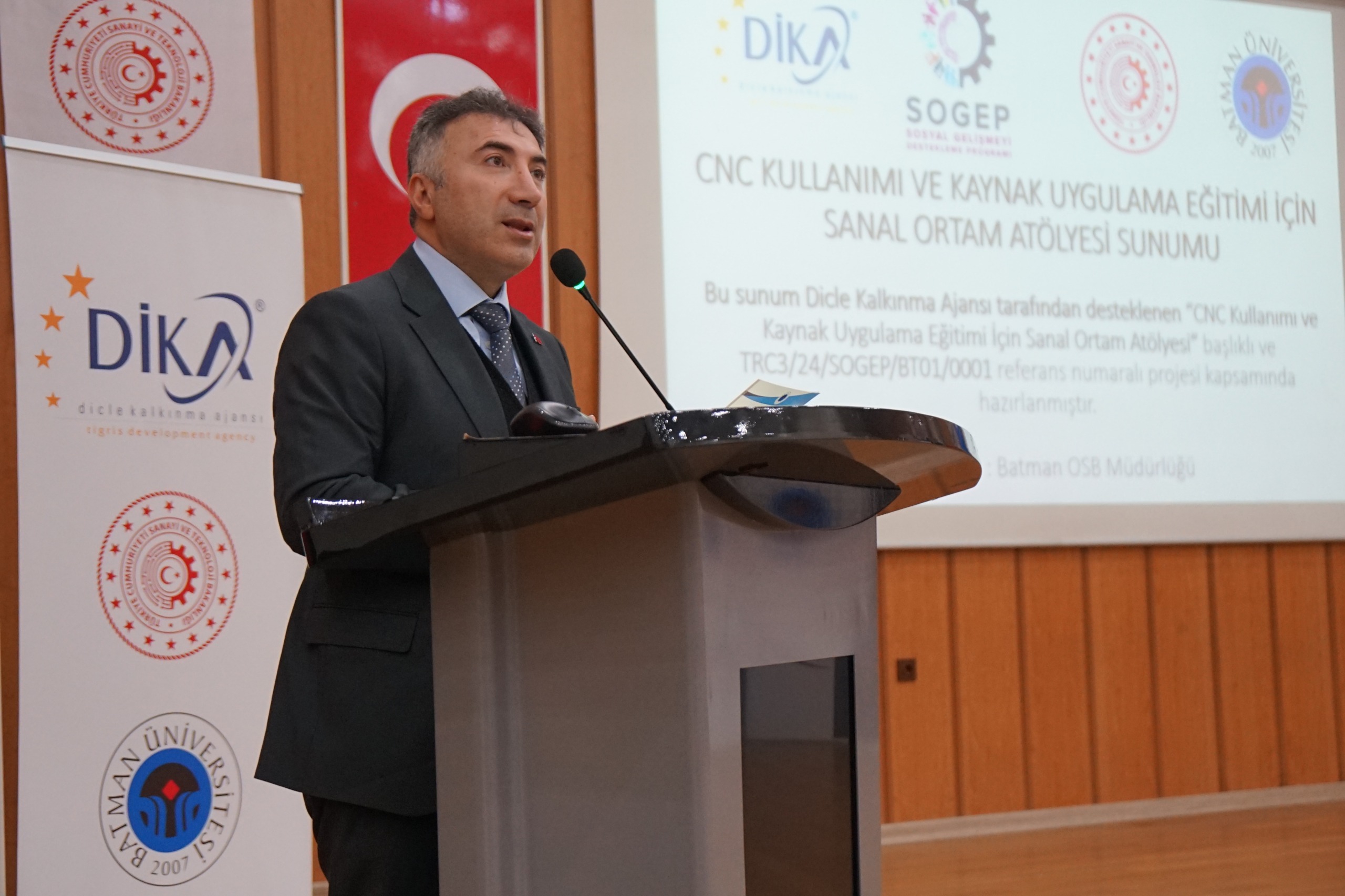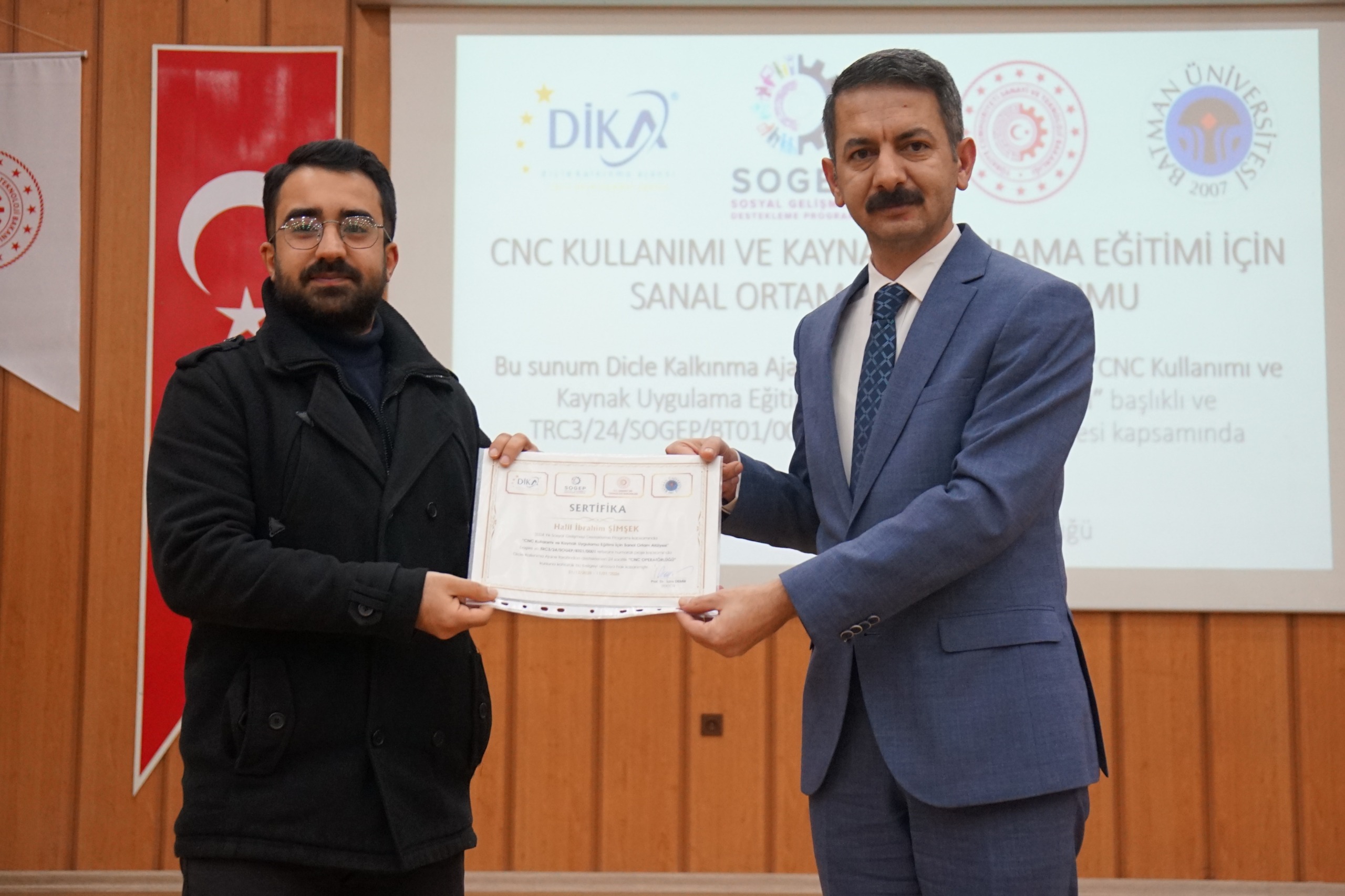 T.C. Sanayi ve Teknoloji Bakanlığı koordinasyonunda, Üniversitemiz tarafından yürütülen ve Dicle Kalkınma Ajansı (DİKA) tarafından Sosyal Gelişmeyi Destekleme Programı (SOGEP) kapsamında desteklenen “CNC Kullanımı ve Kaynak Uygulama Eğitimi İçin Sanal Ortam Atölyesi Projesi”, düzenlenen kapanış ve sertifika töreniyle başarıyla tamamlandı. Üniversitemiz ev sahipliğinde gerçekleştirilen programa; Rektörümüz Prof. Dr. İdris Demir, Batman Organize Sanayi Bölgesi Müdürü Zeynep Akbel, DİKA Temsilcisi Numan Ekici, Batman İŞKUR İl Müdürü Mehmet Emin Aktan, Beşiri OSB Meslek Yüksekokulu Müdürü Doç. Dr. Kadri Kurt, proje yürütücüsü Beşiri OSB Meslek Yüksekokulu Öğretim Üyesi Doç. Dr. Oktay Adıyaman ile akademik ve idari personel ile kursiyerler katıldı. Programın açılış konuşmasını yapan Rektörümüz Prof. Dr. İdris Demir, yürütülen projenin temel amacının öğrencilerin ve kursiyerlerin mesleki becerilerini uygulamalı eğitimle güçlendirmek olduğunu belirtti. Rektörümüz Prof. Dr. Demir, Beşiri Organize Sanayi Bölgesi Meslek Yüksekokulu bünyesinde kurulan sanal atölyeler sayesinde CNC simülatörü ve kaynak uygulamalarının güvenli bir ortamda, birebir gerçeklik deneyimiyle öğretildiğini ifade etti. İlk etapta 100 kursiyerin eğitimlerden faydalandığını aktaran Rektörümüz Prof. Dr. Demir, projenin sanayinin ihtiyaç duyduğu nitelikli iş gücünün yetiştirilmesine ve mezuniyet öncesi istihdama hazırlık sürecine önemli katkı sağladığını kaydetti. Proje yürütücüsü Beşiri OSB Meslek Yüksekokulu Öğretim Üyesi Doç. Dr. Oktay Adıyaman ise sunumunda proje kapsamında kurulan sanal atölyelere ilişkin teknik bilgiler paylaştı. Konuşmaların ardından projeyi başarıyla tamamlayan kursiyerlere sertifikaları; Rektörümüz Prof. Dr. İdris Demir, Batman OSB Müdürü Zeynep Akbel, DİKA Temsilcisi Numan Ekici, Batman İŞKUR İl Müdürü Mehmet Emin Aktan ve Beşiri OSB Meslek Yüksekokulu Müdürü Doç. Dr. Kadri Kurt tarafından takdim edildi. Program, sertifika alan kursiyerlerle birlikte çekilen toplu hatıra fotoğrafının ardından sona erdi. Öte yandan proje kapsamında CNC tezgâhları ve kaynak uygulamaları simülatörler aracılığıyla sanal ortamda, birebir gerçekliğe yakın bir deneyimle gerçekleştirildi. Bu sayede iş kazası riski olmadan nitelikli temel mesleki eğitim imkânı sunuldu. Ayrıca üç boyutlu sanal ortam uygulamaları ve yapay zekâ destekli simülatörler aracılığıyla kursiyerlerin performansları anlık ve objektif şekilde değerlendirildi. Beşiri Organize Sanayi Meslek Yüksekokulu öğrencilerinin eğitimlerini tamamlamalarının ardından sanal atölyelerdeki CNC simülatörü ile kaynak uygulamalarının ilimizde bulunan mesleki eğitim kurumları ile sanayi ve üretim kuruluşlarının istifadesine açık olacağı kaydedildi.