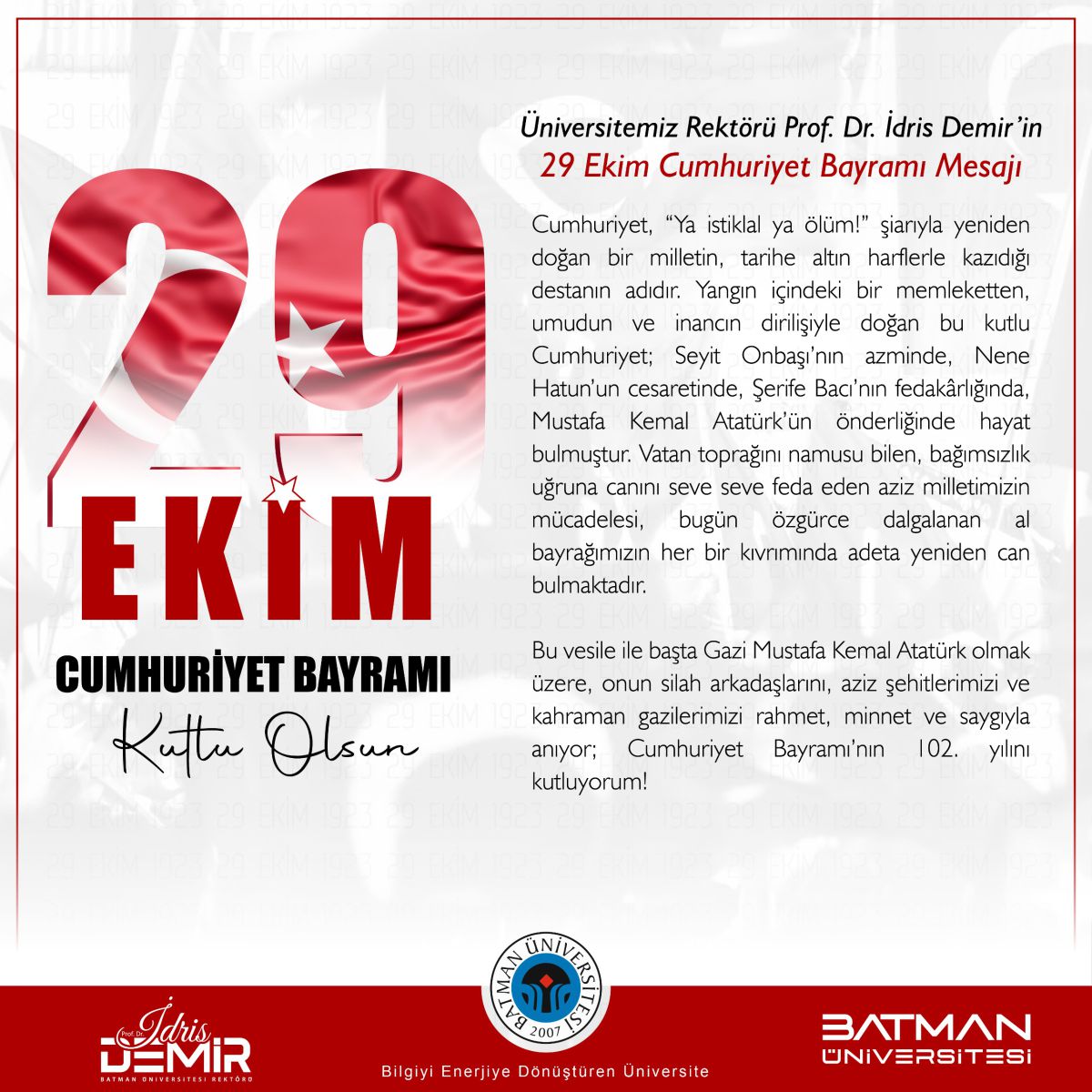 Üniveritemiz Rektörü Prof. Dr. İdris Demir’in 29 Ekim Cumhuriyet Bayramı Mesajı