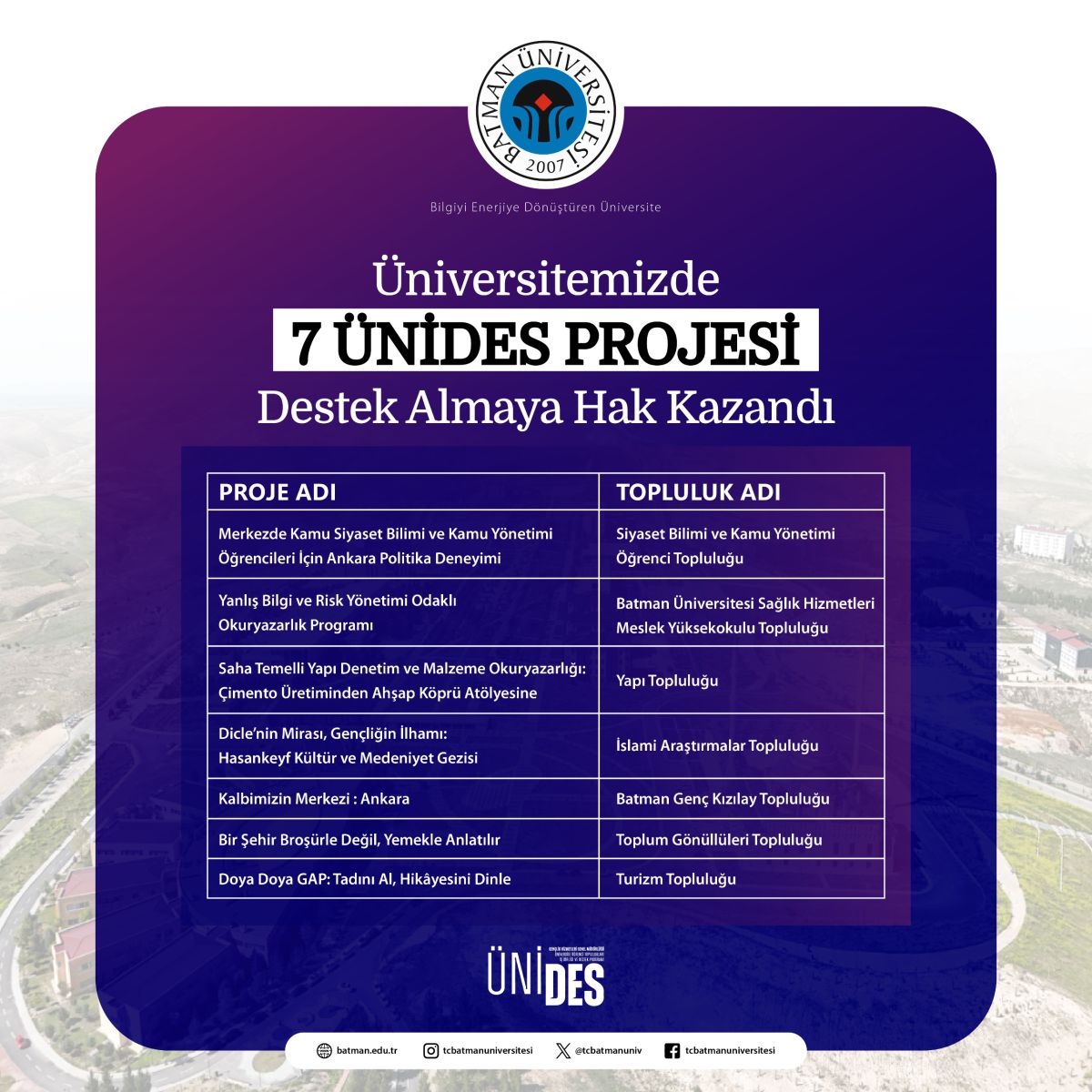 Program kapsamında Batman Genç Kızılay Topluluğu’nun “Kalbimizin Merkezi: Ankara”, Siyaset Bilimi ve Kamu Yönetimi Öğrenci Topluluğu’nun “Merkezde Kamu: Siyaset Bilimi ve Kamu Yönetimi Öğrencileri İçin Ankara Politika Deneyimi” ve Turizm Topluluğu’nun “Doya Doya GAP: Tadını Al, Hikâyesini Dinle” projeleri ulusal kategori kapsamında desteklenmeye değer bulundu.