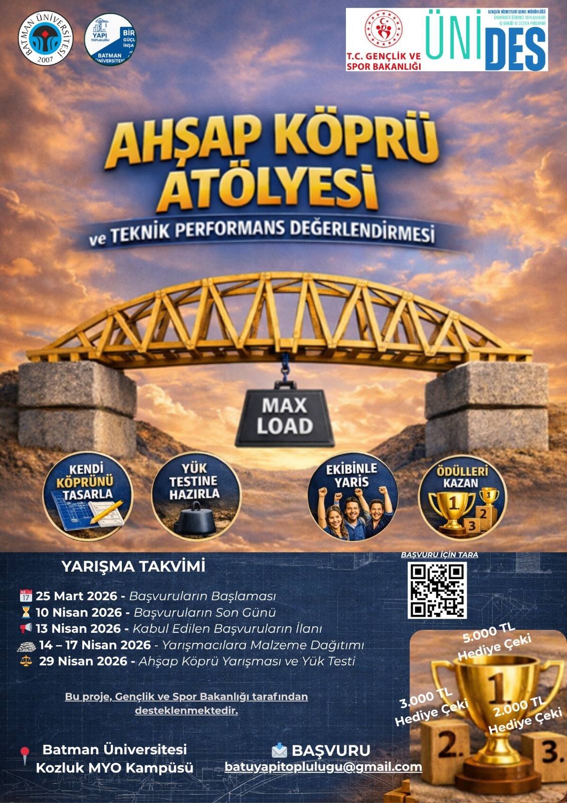 Üniversitemiz Yapı Topluluğu tarafından, Gençlik ve Spor Bakanlığı destekli Üniversite Öğrenci Toplulukları İş Birliği ve Destek Programı (ÜNİDES) kapsamında “Ahşap Köprü Atölyesi ve Teknik Performans Değerlendirmesi Yarışması” düzenlenecek. 29 Nisan 2026 tarihinde saat 10.00’da Üniversitemiz Kozluk Meslek Yüksekokulu Kampüsünde gerçekleştirilecek yarışmada öğrencilerin taşıyıcı sistem davranışı, yük aktarım mekanizması, malzeme verimliliği, denge ve dayanım gibi temel yapı mühendisliği kavramlarını uygulamalı olarak deneyimlemeleri hedefleniyor. Program kapsamında öğrenciler, ahşap köprü modelleri tasarlayıp üretecek ve bu yapılar yükleme testine tabi tutularak taşıma kapasitesi, malzeme verimliliği ve yapısal performans kriterlerine göre değerlendirilecek. Akademik personelin jüri üyesi olarak görev alacağı yarışmada tasarımlar mühendislik kriterleri doğrultusunda incelenecek. Kozluk Meslek Yüksekokulu İnşaat Bölümü Yapı Denetimi Programı öğretim elemanlarından Öğr. Gör. M. Ali Erçetin’in akademik danışmanlığında yürütülecek ve başvuruları tamamlanan yarışmada, kabul edilen başvuruların ilanının ardından 14–17 Nisan tarihleri arasında yarışmacılara malzeme dağıtımı yapılacak. Büyük final ve yük testi ise 29 Nisan 2026 tarihinde saat 10.00’da gerçekleştirilecek. Dereceye giren öğrencilere birinciye 5.000 TL, ikinciye 3.000 TL ve üçüncüye 2.000 TL tutarında hediye çekleri verilecek. Yarışma öğrencilerin ekip çalışması, problem çözme ve teknik sunum becerilerini geliştirmeyi aynı zamanda uygulama temelli öğrenme ve proje üretme kültürünü desteklemeyi amaçlıyor.