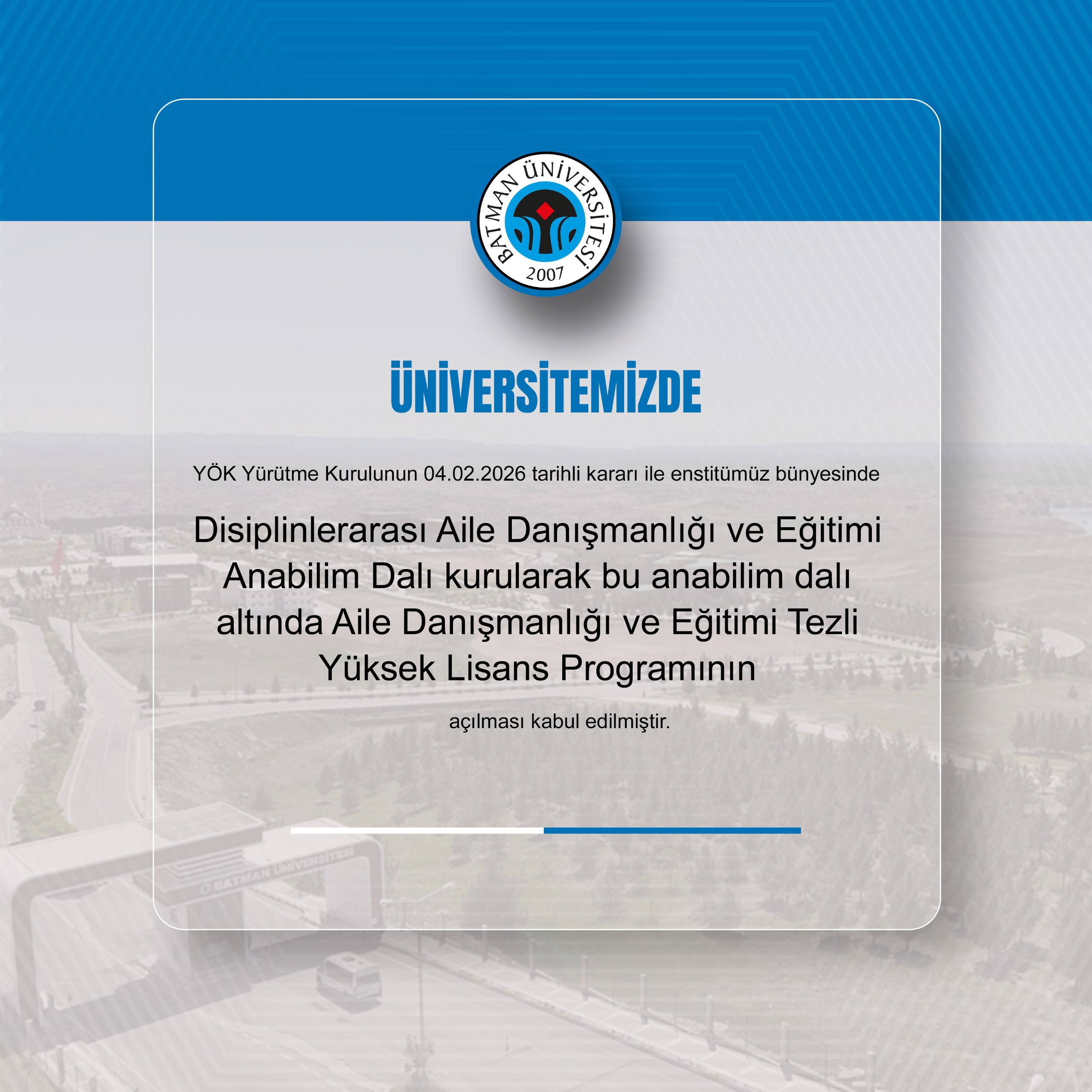 Yükseköğretim Kurulu (YÖK) kararıyla, Üniversitemiz Lisansüstü Eğitim Enstitüsü bünyesinde Disiplinlerarası bir program olarak Aile Danışmanlığı ve Eğitimi Anabilim Dalı kuruldu. Bu kapsamda Aile Danışmanlığı ve Eğitimi Tezli Yüksek Lisans Programında öğrencilerin lisansüstü eğitim görmeleri sağlanacak.