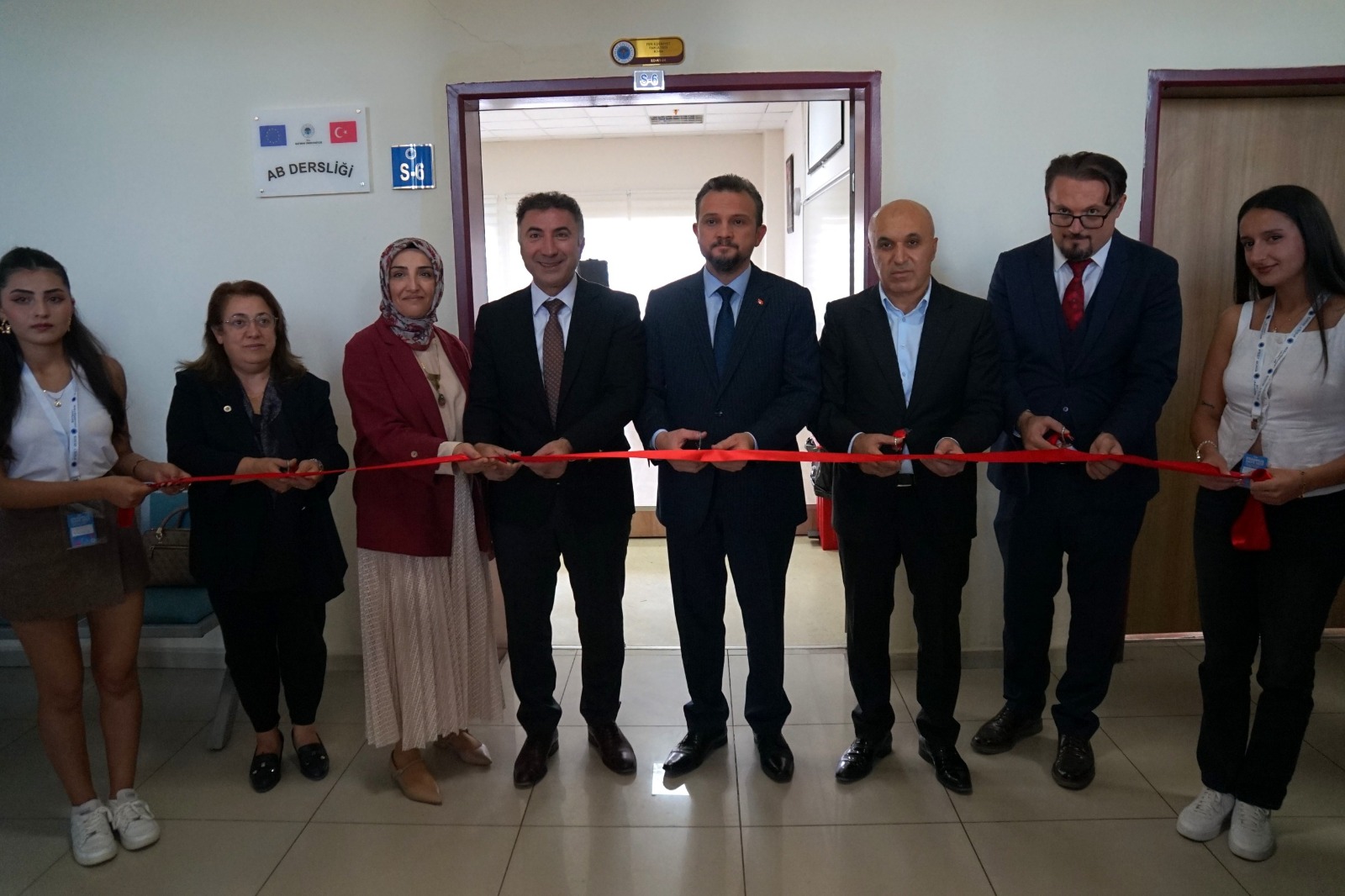 Üniversitemizde Avrupa Birliği Dersliği, düzenlenen törenle hizmete açıldı. Açılış töreninde Üniversitemiz Rektörü Prof. Dr. İdris Demir ve Dışişleri Bakanlığı Türkiye Ulusal Ajansı Başkanı İlker Astarcı, rektör yardımcıları ve akademisyenler kurdeleyi keserek Avrupa Birliği Dersliği’nin açılışını gerçekleştirdi.
