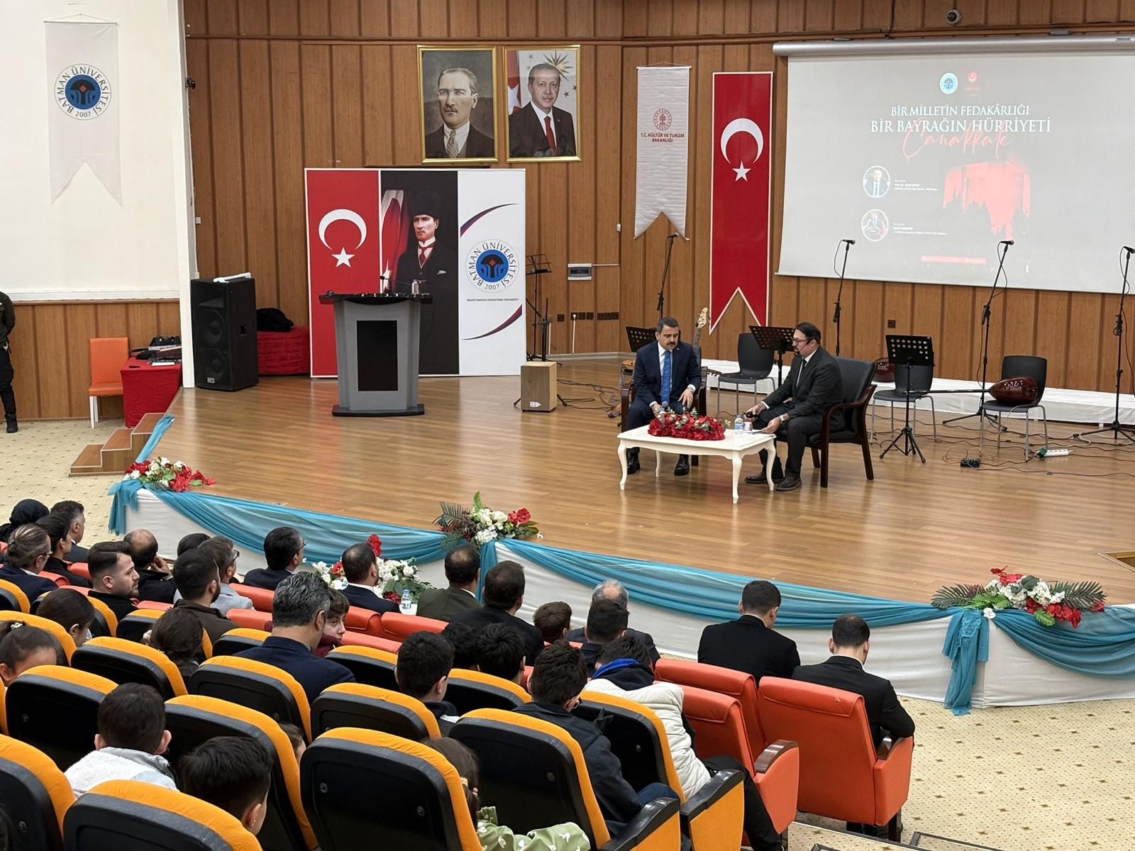 Üniversitemiz, Çanakkale Destanı’nın 111. yıl dönümünde zaferin tarihi önemini ve milli mücadele ruhunu derinlemesine ele alan anlamlı bir söyleşiye ev sahipliği yaptı. Çanakkale Mobil Müzesinin Merkez Kampüste ziyaretçilerle buluşturulması vesilesiyle gerçekleştirilen "Bir Milletin Fedakârlığı, Bir Bayrağın Hürriyeti: Çanakkale" konulu programa Valimiz Ekrem Canalp’in eşi Dr. Ayten Canalp, Milletvekilimiz Ferhat Nasıroğlu, Rektörümüz Prof. Dr. İdris Demir ve eşi Zeynep Demir, Çanakkale Savaşları Gelibolu Tarihi Alan Başkanı Av. İsmail Kaşdemir, il protokolü, öğretim üyeleri ve öğrenciler katıldı. İl Protokolü ve ziyaretçilerin Mobil Müze’yi ziyaret etmesinin ardından gerçekleştirilen söyleşinin açılış konuşmasını Rektörümüz Prof. Dr. İdris Demir ve Milletvekilimiz Ferhat Nasıroğlu yaptı. 9 yaşındaki bir ilkokul öğrencisinin Türkçe dersinde yazdığı Çanakkale kompozisyonundan hareketle Çanakkale’nin yetişen kuşaklar üzerindeki tesirine değinen Rektör Prof. Dr. Demir, “O gün dünyanın en güçlü donanmaları Boğaz’a dayanmış, cephelerde amansız mücadeleler verilmişti. Fakat karşılarında yalnızca silahlı bir kuvvet değil; inançla kenetlenmiş bir millet vardı. Bu sarsılmaz irade, tarihe silinmez bir söz bıraktı: ‘Çanakkale Geçilmez.’ Bu ifade, yalnızca askerî bir başarının değil; bir milletin bağımsızlık azminin, birlik ruhunun ve vatan sevgisinin ifadesidir. Aradan geçen onca yıla rağmen görüyoruz ki Çanakkale yalnızca geçmişte kalmış bir hatıra değildir. Çanakkale yaşayan bir bilinçtir. Çünkü bugün Anadolu’nun bir köşesinde, henüz dokuz yaşındaki bir çocuğun kalbinde dahi aynı duyarlılığı, aynı vatan sevgisini görmek mümkündür. Küçücük yüreklere sığan o büyük sevgi, kalemle yazılan satırlarda, yapılan dualarda ve hissedilen sorumlulukta kendini göstermektedir.” ifadelerini kullandı. Rektör Prof. Dr. İdris Demir’in akabinde konuşan Batman Milletvekili Ferhat Nasıroğlu, Çanakkale’de Balkanlardan Kutsal Topraklara değin uzak coğrafyalardan gelenler kahramanlarla omuz omuza mücadele veren Batmanlı vatan evlatlarının aziz hatırasına vurgu yaparak yurt topraklarımızın birlik, beraberlik ve vatan sevgisiyle yoğrulduğunu ifade etti. Milletvekili Nasıroğlu, geçmişten alınan ilhamla geleceğe daha güçlü adımlar atılacağını belirterek Çanakkale ruhunun yurdun dört bir yanında her daim yaşatıldığını vurguladı. Açılış konuşmalarının ardından söyleşiye geçildi. Tarih bilincini tazelemek ve Çanakkale ruhunu yeni nesillere aktarmak amacıyla düzenlenen söyleşinin moderatörlüğünü Rektör Yardımcımız Prof. Dr. Yusuf Çınar üstlendi. Söyleşinin özel konuğu ve konuşmacısı ise bu tarihi mirası en yakından tanıyan ve bu ata mirası toprakların idaresini deruhte eden isimlerden olan Çanakkale Savaşları Gelibolu Tarihi Alan Başkanı ve TBMM 24. Dönem Milletvekili Av. İsmail Kaşdemir idi. Söyleşide, Çanakkale destanının yazıldığı topraklarda yaşanan benzersiz fedakârlıklar ve bağımsızlık mücadelesi tüm yönleriyle ele alan Av.Kaşdemir. Çanakkale Savaşlarının tarihi anlam ve önemi üzerinde durarak milli beraberliğin en önemli sembolü olduğu vurguladı. Milli birlik ve beraberlik şuurunu pekiştiren etkinlik, Üniversitemiz Güzel Sanatlar Fakültesi Korosu tarafından verilen “Çanakkale Türküleri Konseri” ve Çanakkale Savaşları Mobil Müzesi’nin ziyaretiyle sona erdi.