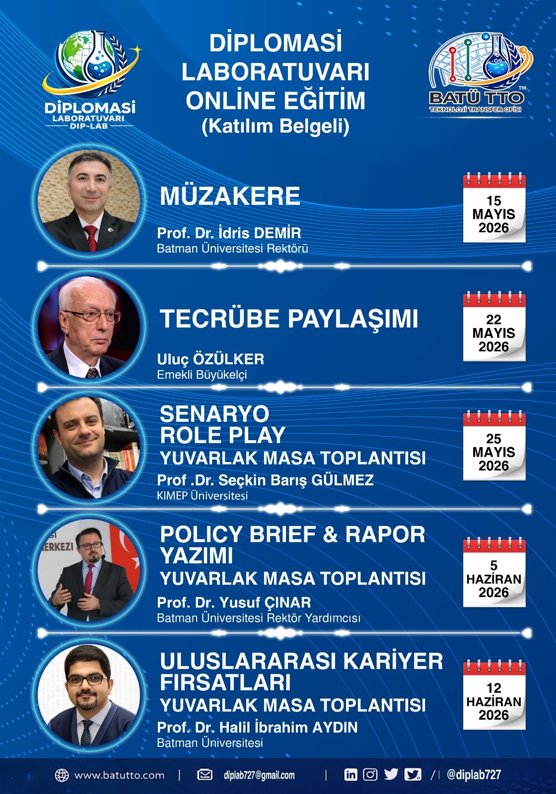 Üniversitemiz Teknoloji Transfer Ofisi bünyesinde faaliyet gösteren Diplomasi Laboratuvarı (Dip-Lab) tarafından düzenlenen “Diplomasi Laboratuvarı Online Eğitimleri” 15 Mayıs 2026 tarihinde başlıyor. Katılım belgeli olarak planlanan eğitim programında diplomasi alanına yönelik teorik ve uygulamalı içerikler katılımcılarla buluşturulacak.