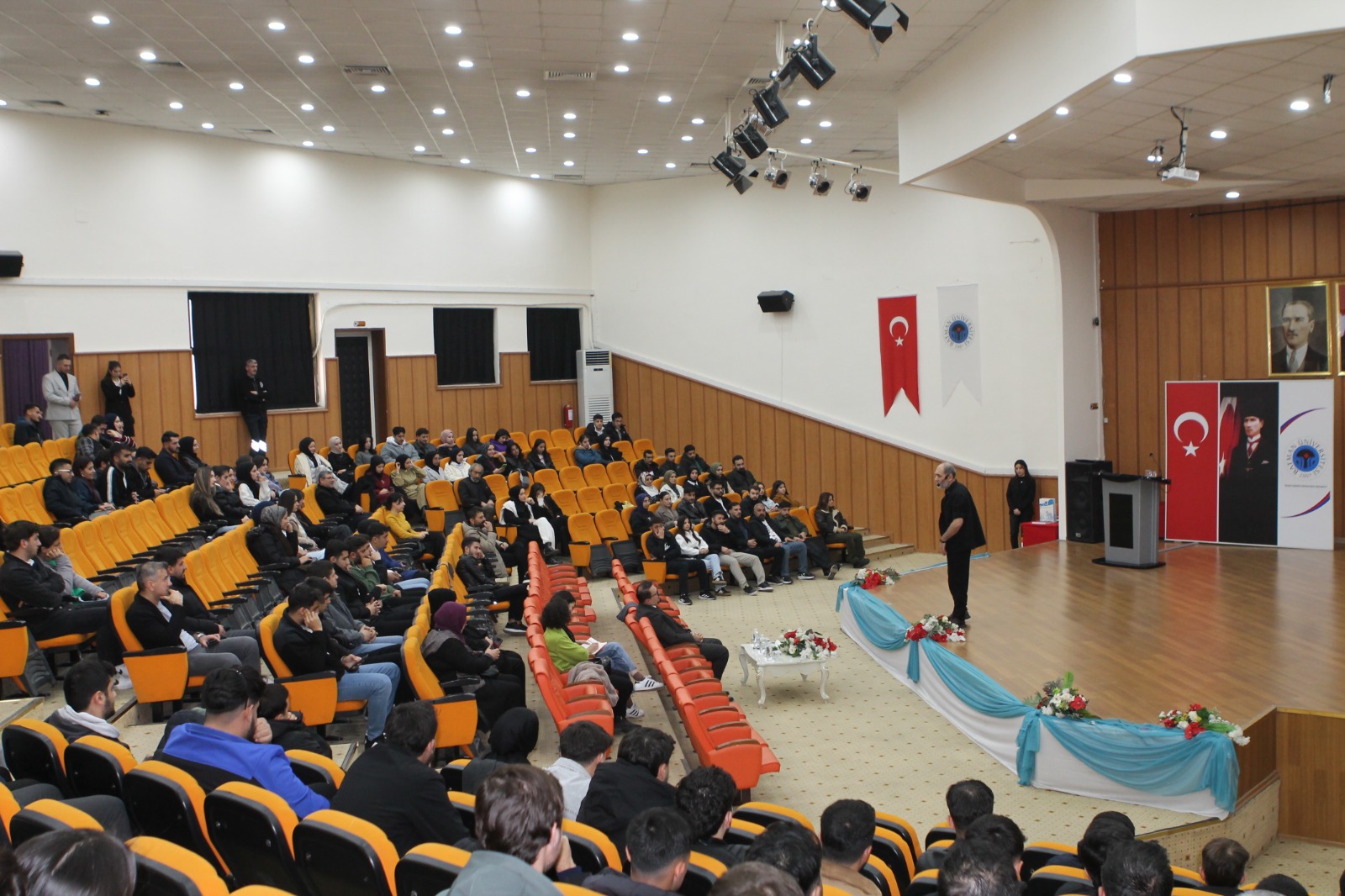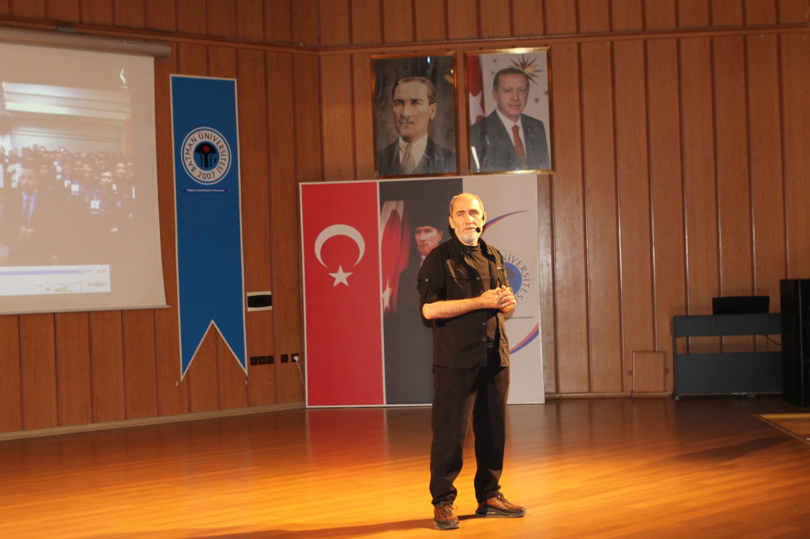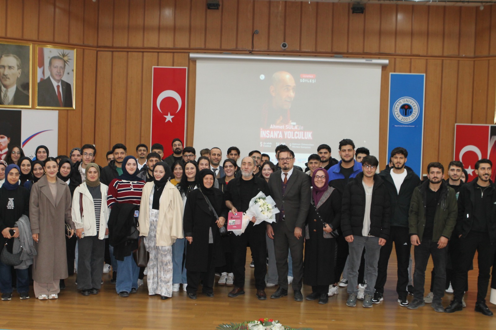 Ressam, Kaligraf, ve Sanatçı Ahmet Sula “İnsan’a Yolculuk” başlıklı söyleşi ile Üniversitemiz öğrencileriyle bir araya geldi. Üniversitemiz Merkez Kampüs Konferans Salonunda gerçekleşen söyleşi, Rektör Yardımcısı Prof. Dr. Yusuf Çınar’ın açılış konuşmasıyla başladı. Konuşmasında öğrencilerin kişisel gelişimine katkı sağlayacak bu tür etkinliklerin önemine değinen Prof. Dr. Çınar, Ahmet Sula’yı üniversitede ağırlamaktan duydukları memnuniyeti dile getirdi.