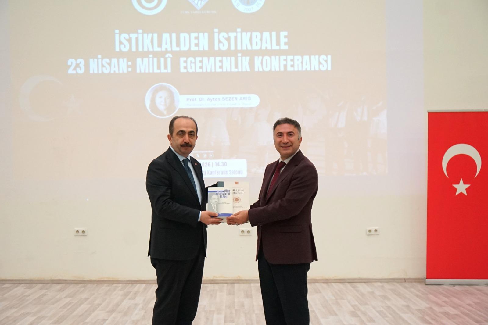 Açılış konuşmalarının ardından Hacettepe Üniversitesi Öğretim Üyesi Prof. Dr. Ayten Sezer Arığ “İstiklâlden İstikbale 23 Nisan: Millî Egemenlik” başlıklı konferansını verdi. Prof. Dr. Arığ, millî egemenliğin tarihsel kökenlerini, Cumhuriyet’in kuruluşundaki rolünü ve toplumsal hafızadaki yerini kapsamlı bir şekilde ele alarak “İstiklalden İstikbale” uzanan süreçte tarihin birçok kritik anında Mustafa Kemal Atatürk’ün attığı adımların birer dönüm noktası olduğunu vurguladı. Birlik ve beraberliğin önemine dikkat çeken Prof. Dr. Arığ, “Birlikten kuvvet doğar” anlayışının millet olma bilincinin temelini oluşturduğunu ifade etti. 23 Nisan’ın milli bayram olarak kabul edilme sürecine de değinen Prof. Dr. Arığ, geçmişten bugüne uzanan tarihi süreci değerlendirerek gençlere hitaben, “Geçmişten nasıl geldik, geleceğe nasıl gideceğiz sorusunu iyi düşünmeliyiz” sözleriyle konuşmasını tamamladı.