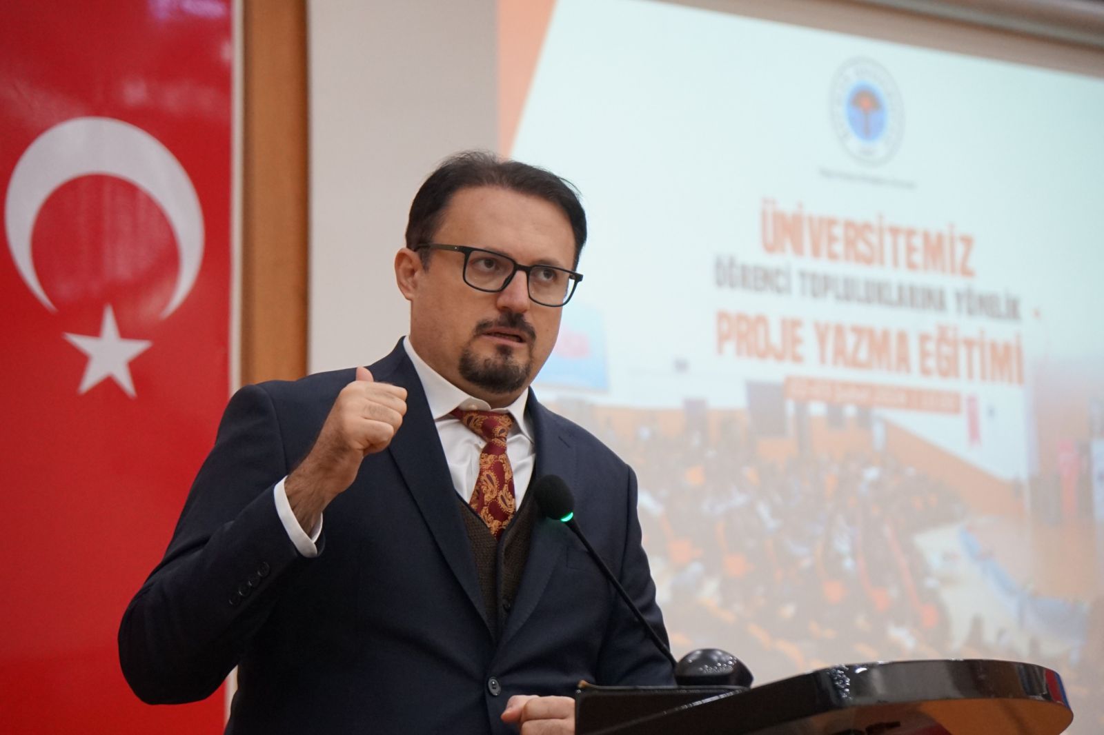 Eğitimin açılış konuşmasını yapan Üniversitemiz Rektör Yardımcısı Prof. Dr. Necmettin Sezgin, proje yazma çalışmalarının belirli bir sistematik içinde yürütülmesinin önemine dikkat çekti. Proje sürecinin fikir aşamasından uygulamaya kadar planlı ve disiplinli bir yaklaşım gerektirdiğini ifade eden Prof. Dr. Sezgin, öğrencilerin proje yazma, başvuru ve uygulama süreçlerine hâkim olmalarının akademik gelişimlerine önemli katkı sunduğunu belirtti. Düzenlenen Proje Yazma Eğitimi’nin, öğrencilerin proje üretme süreçlerini doğru yöntemlerle öğrenmelerine imkân sağlayacağını ifade etti.