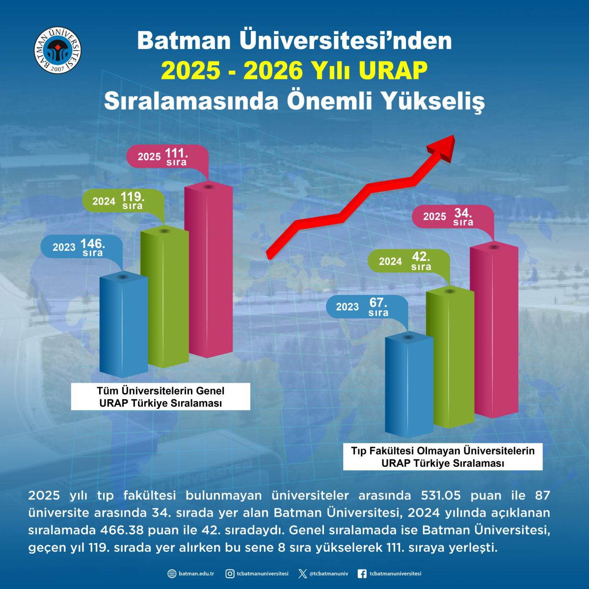 Üniversitemiz 2024 yılında tıp fakültesi bulunmayan üniversiteler arasında 466.38 puan ile 84 üniversite arasında 42. sırada yer alırken 2025 yılında 87 üniversite arasında 531.05 puan ile 34. sıraya yükseldi.